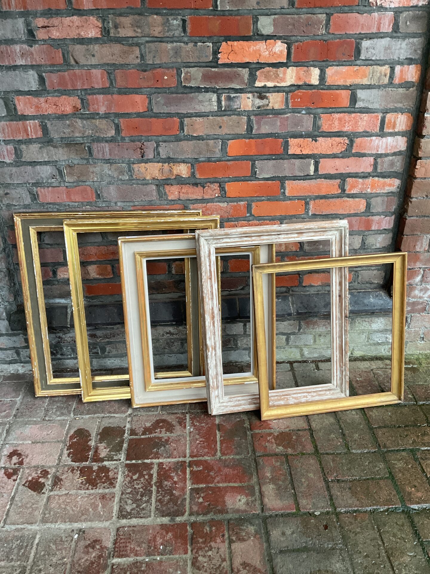 This lot comprises five vintage picture frames, each constructed from wood and finished with a gilt surface. The frames vary in size and detailing, offering a range of options for displaying artwork, photographs, or mirrors. The varying widths and profiles suggest they span several decades of design, adding character and visual interest.