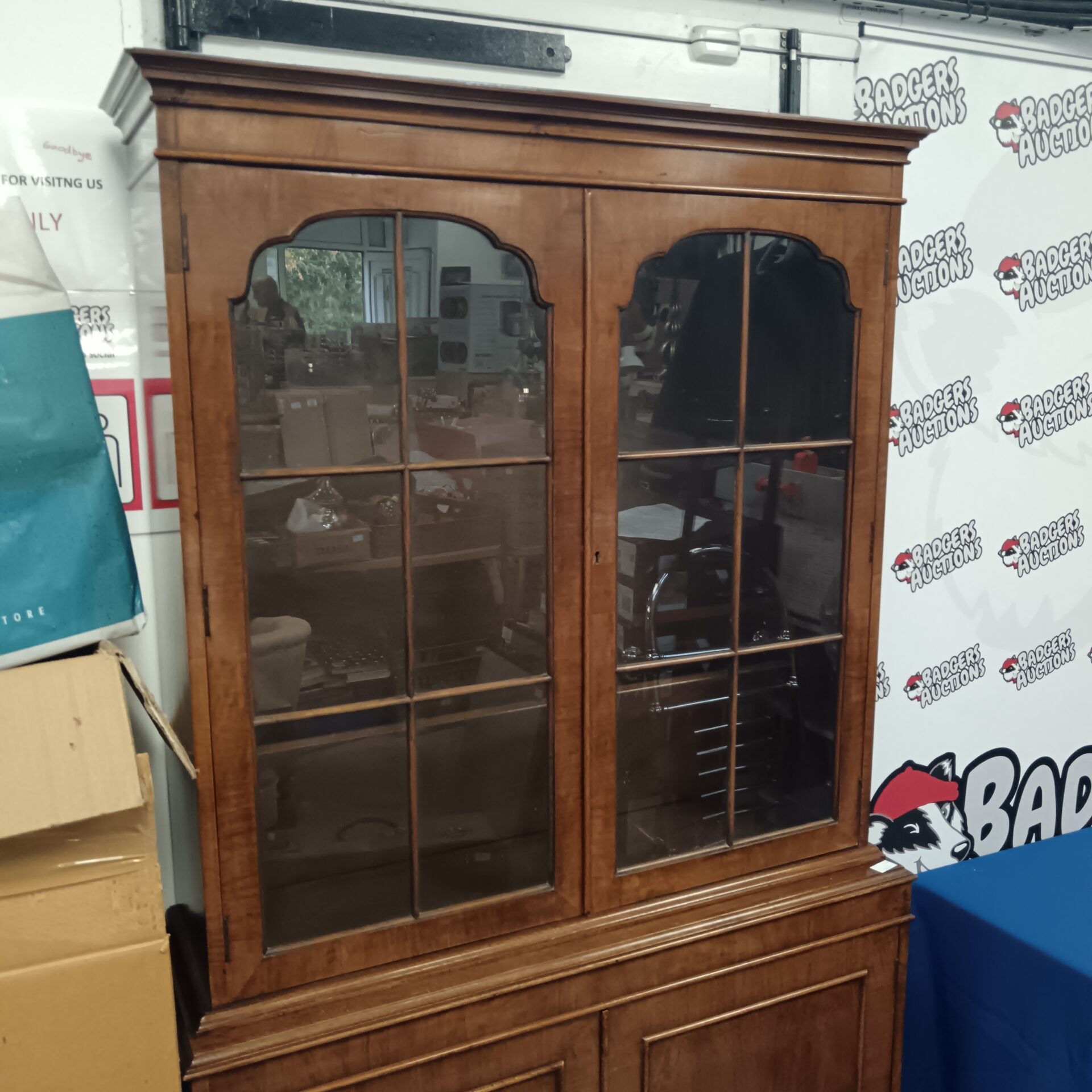 This handsome vintage bookcase features a rich wood veneer finish and elegant glass doors, allowing for display of treasured books and collectibles. The cabinet boasts a classic design with a moulded cornice and a solid base, suggesting quality craftsmanship. The interior offers adjustable shelving, providing flexibility for various display needs.