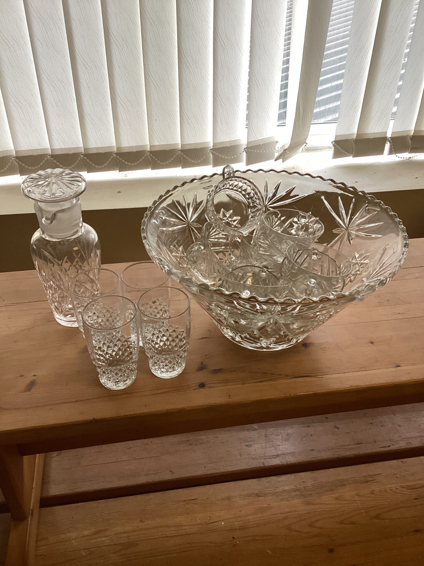 1438 Very Large Glass Punch Bowl With Glasses & Cutglass Cocktail Shaker & Four Glasses