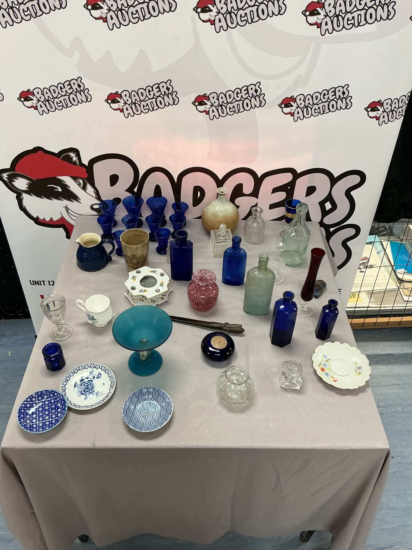 This is a diverse collection of vintage glassware, featuring a variety of colours, shapes, and sizes. The lot includes several antique bottles, some in striking shades of blue and green, alongside decorative glass pieces and smaller items. This collection offers a charming glimpse into glassmaking history and would be a delightful addition to any vintage display or collection.