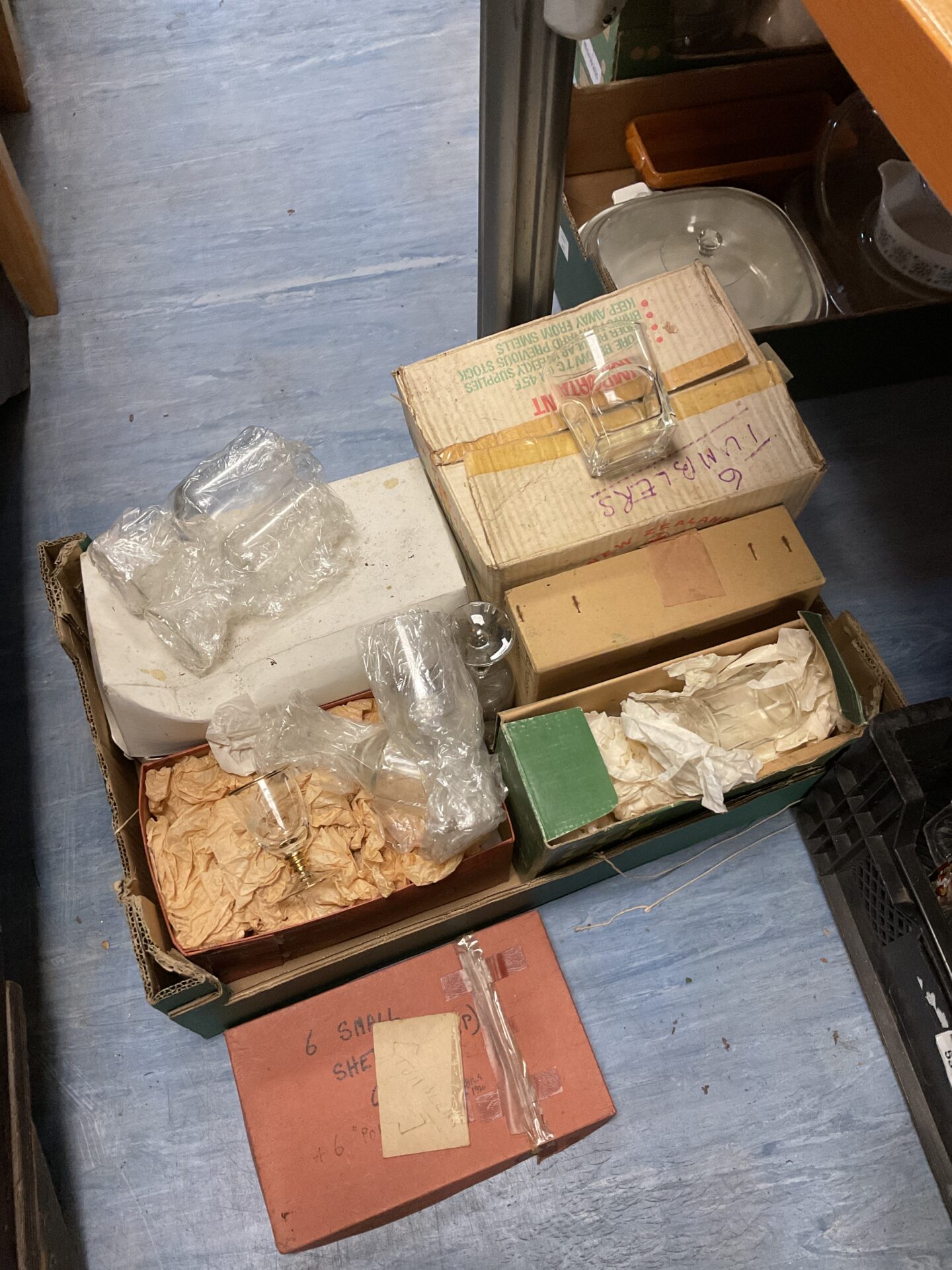 The glassware shows signs of age and use, with potential for minor scratches, wear, or imperfections consistent with vintage items. While the exact number of pieces is not specified, this lot presents an opportunity to acquire a diverse range of vintage glassware at once. Collectors and enthusiasts will appreciate the opportunity to add these pieces to their collections or use them for display and occasional use.