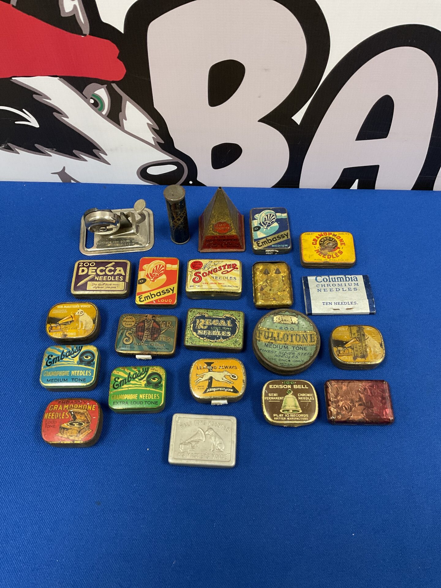 The needles and tins exhibit signs of age and use, consistent with their vintage. Some tins may show wear, corrosion, or minor damage, while the needles themselves may exhibit oxidation. Despite this, the collection remains a desirable item for collectors of vintage audio equipment, gramophone enthusiasts, and those interested in the history of music reproduction.