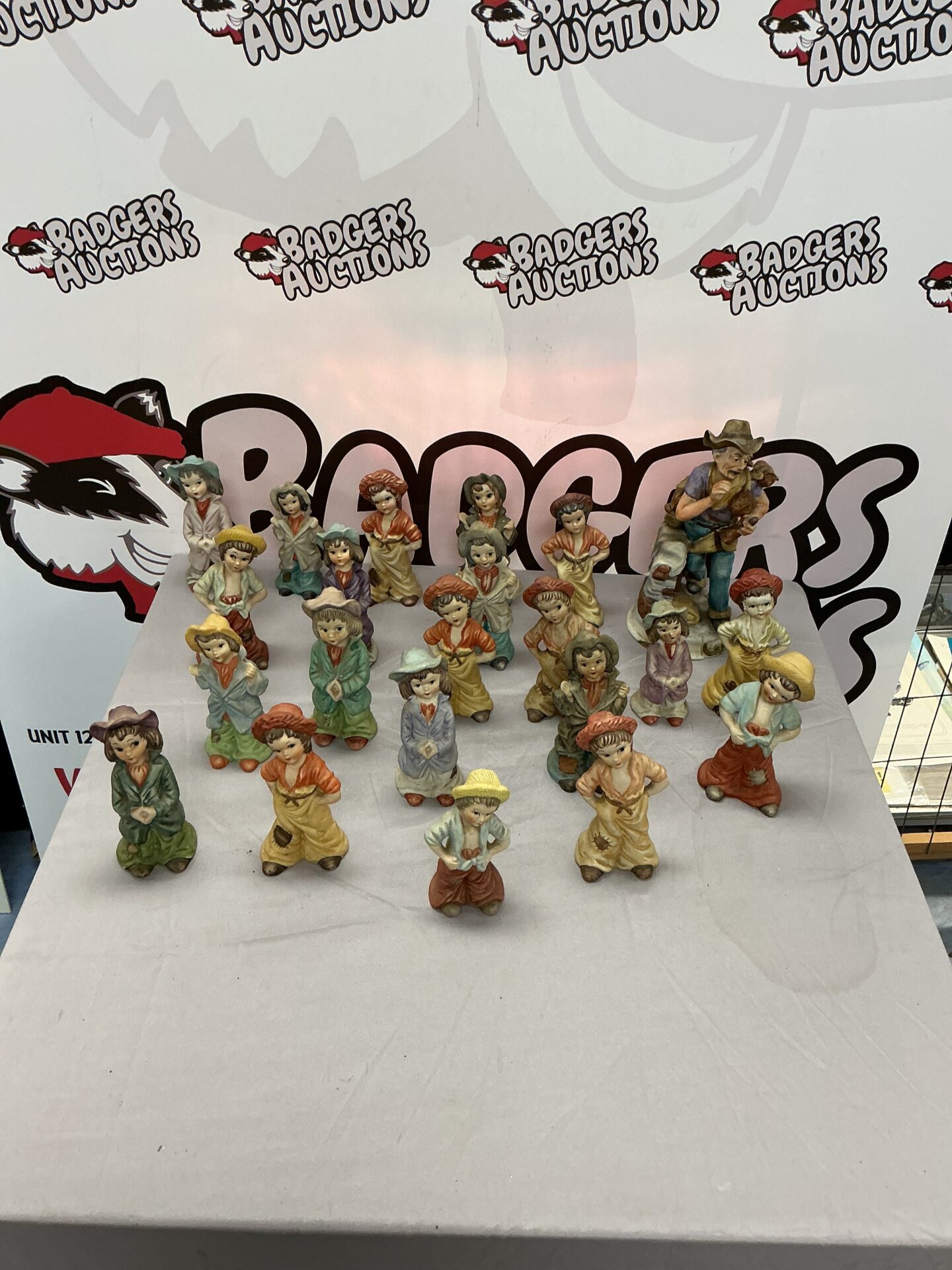 This charming lot comprises a collection of vintage, hand-painted ceramic figures, likely dating from the mid-20th century. The figures depict a variety of characters and scenes, showcasing detailed craftsmanship and vibrant colours. The presence of Brinns figures within the collection suggests a quality manufacture and a focus on detailed characterisation, making them highly sought after by collectors.