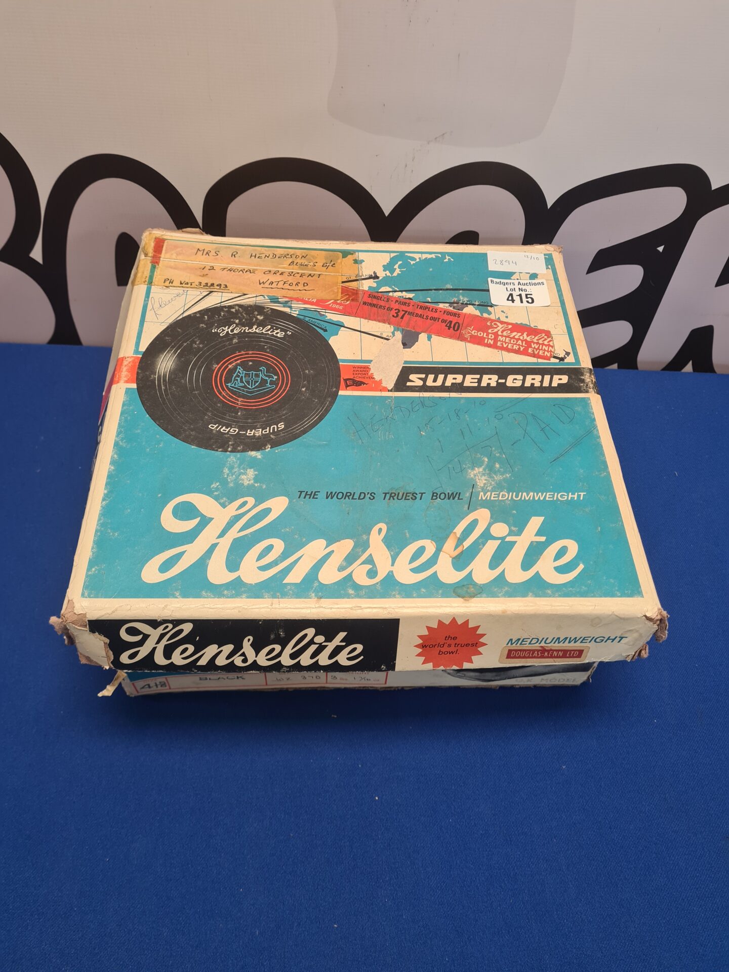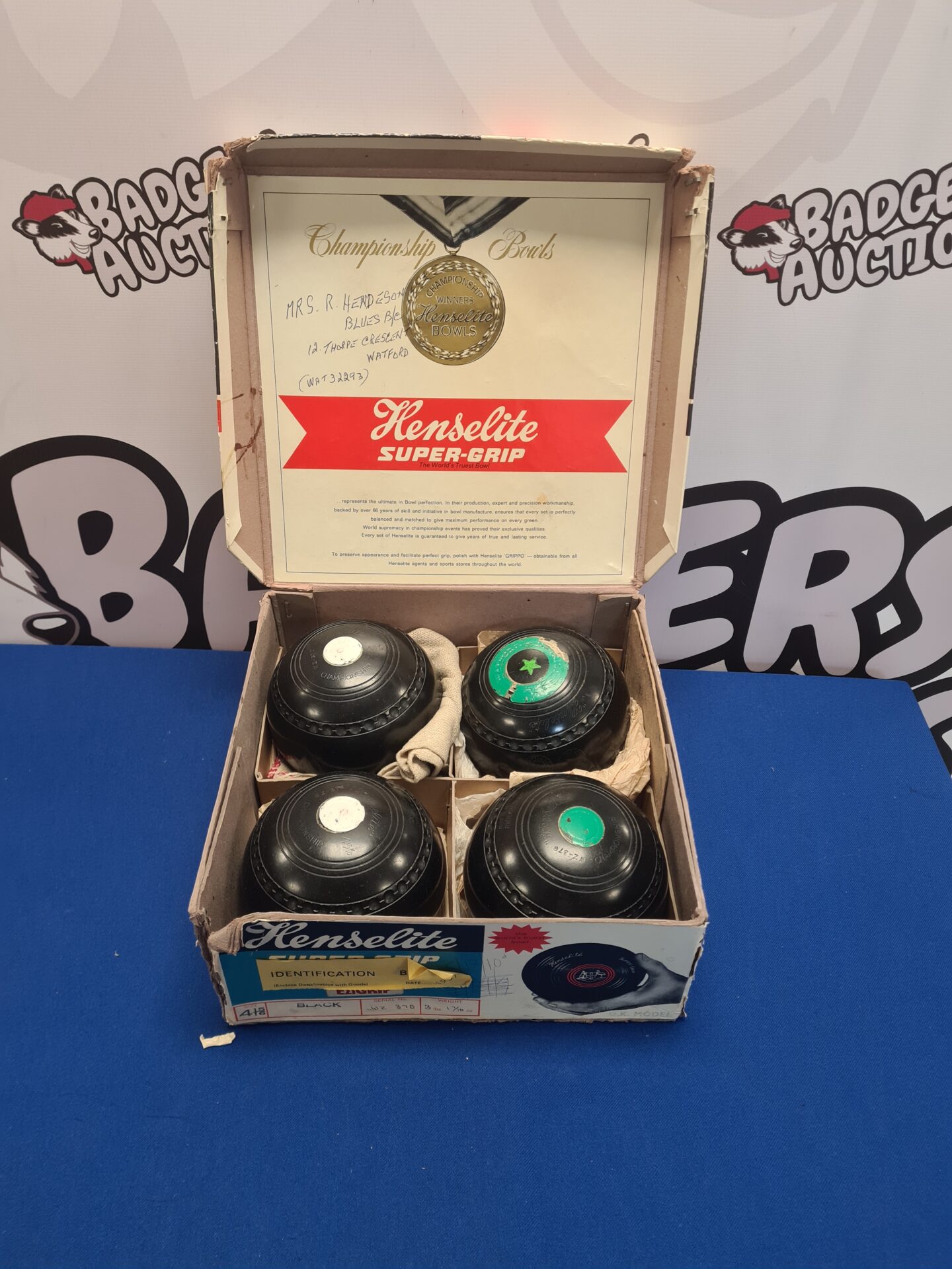 The set appears to be in good vintage condition, with the bowls showing signs of age and use consistent with their history. The original box displays wear and tear commensurate with age, adding to its charm and authenticity. This set would be a welcome addition to any collection of vintage sporting goods or lawn games, appealing to collectors and players alike who appreciate the quality and heritage of Henselite bowls.