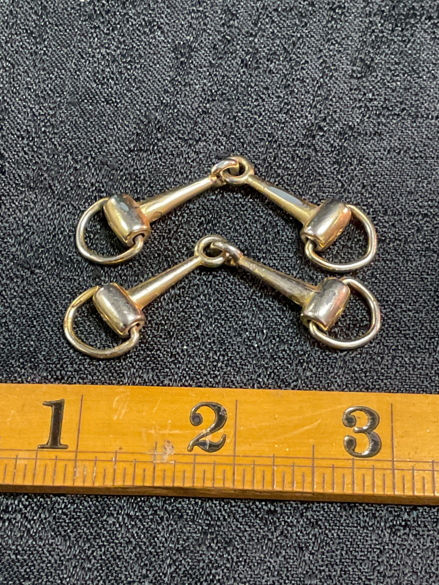These classic cufflinks feature a stylized horse bit design, reminiscent of the iconic aesthetic popularised by Gucci in the 1970s. Crafted from a gold-toned metal, they exhibit a timeless elegance suitable for formal wear or adding a touch of sophistication to everyday attire. The design evokes a sense of equestrian heritage and refined style, making them a desirable accessory for collectors and enthusiasts of vintage jewellery.