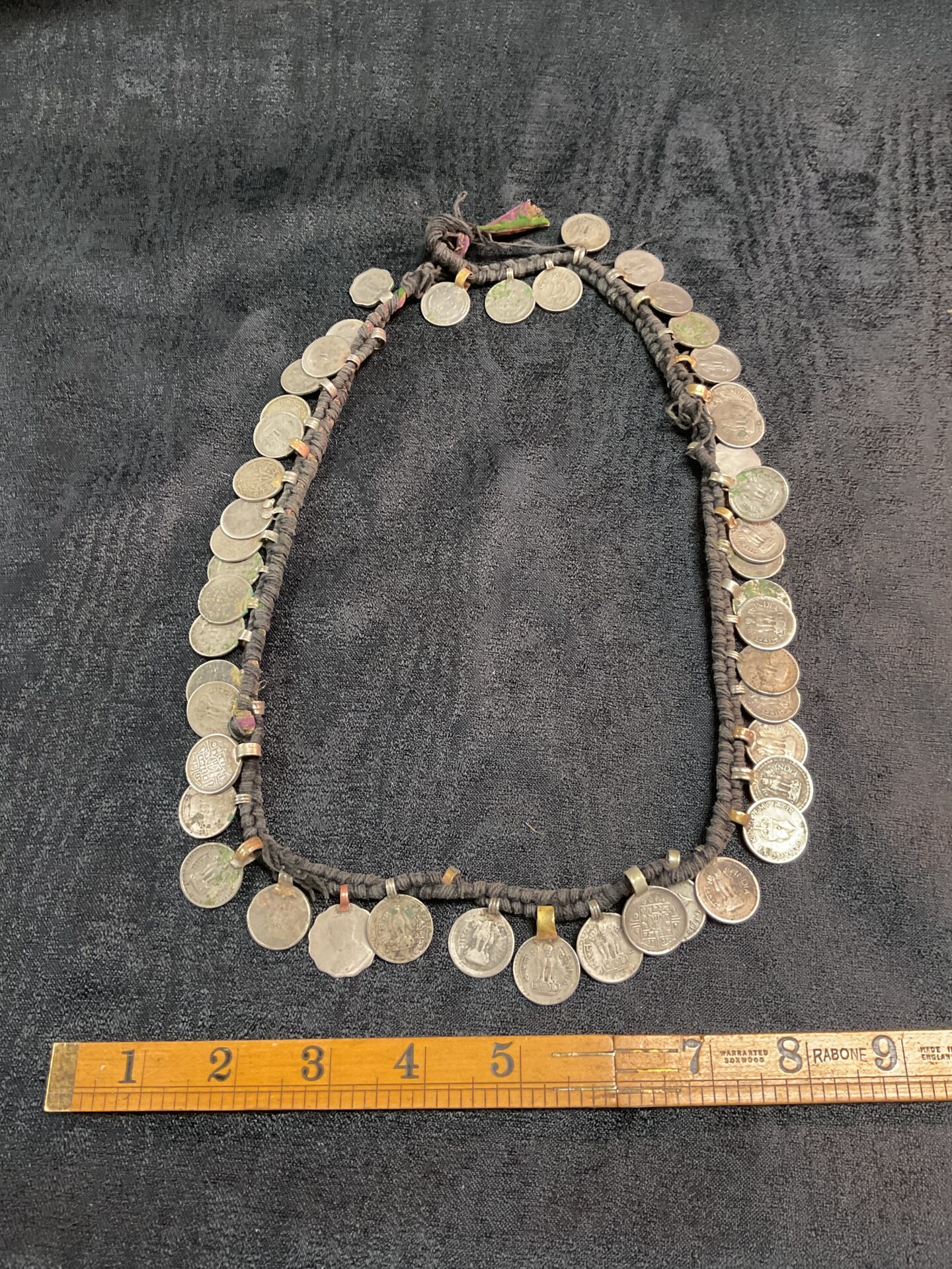 The belt shows signs of age and wear consistent with its vintage nature. Some coins may exhibit minor damage or discoloration, but this contributes to its authentic, aged appearance. This belt would appeal to collectors of ethnic jewellery, tribal art, or vintage accessories. Its unique construction and cultural significance make it a desirable piece for those interested in adding a distinctive item to their collection or incorporating it into a bohemian or eclectic style.