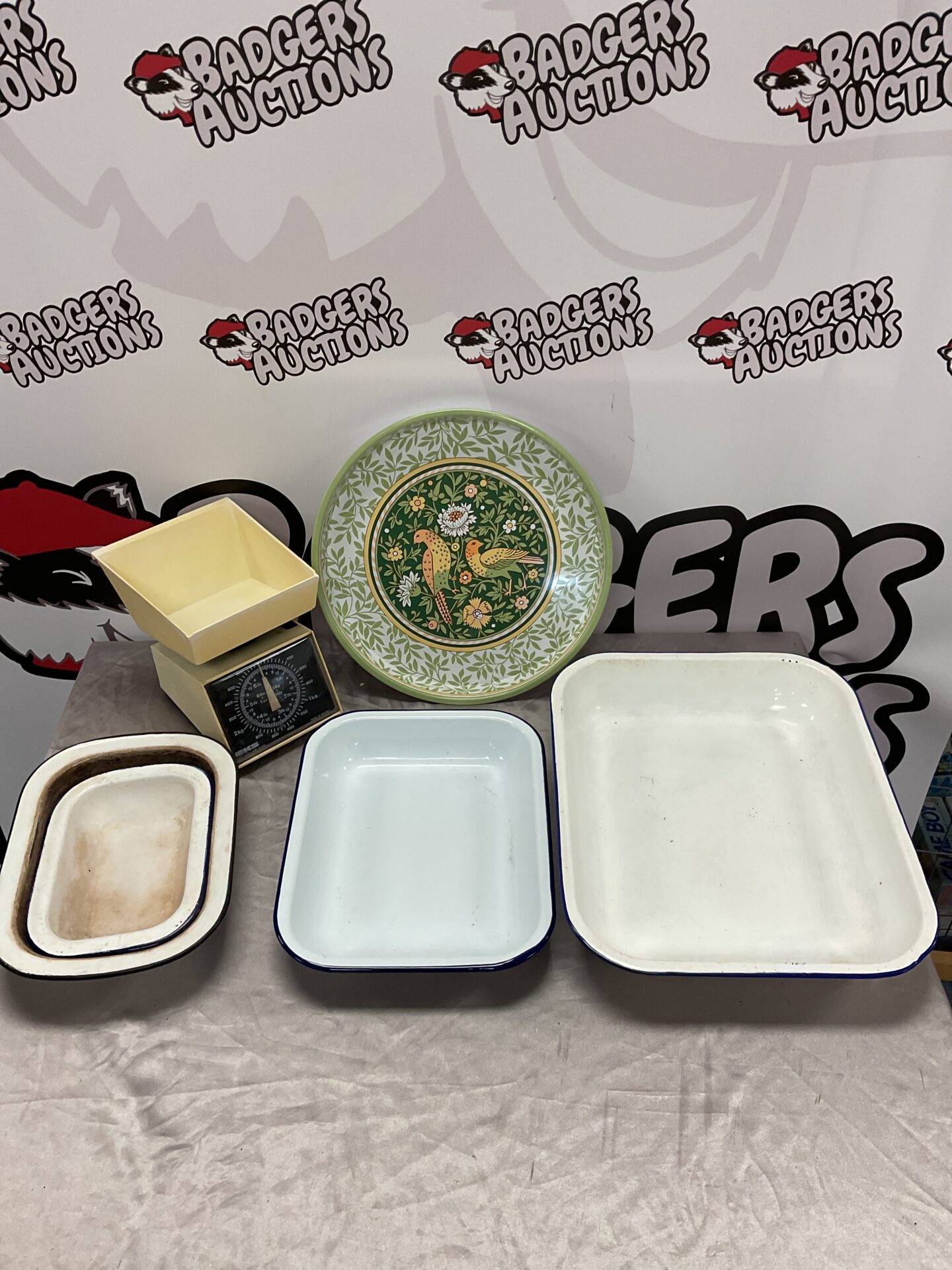This lot features a set of vintage EKS kitchen scales, a classic example of mid-century kitchenalia. The scales boast a traditional design with a white enamel finish and a clear, easy-to-read dial. Included with the scales are several decorative enamel trays, adding a touch of retro charm and functionality to any kitchen or display.