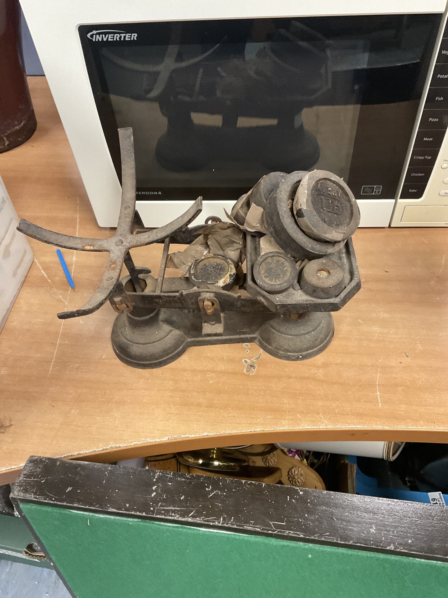 These are a set of vintage kitchen scales, constructed from cast iron. The scales feature a traditional balance design, with pans suspended from a central beam. These scales would have been used for accurately measuring ingredients in a pre-digital era, offering a charming and functional piece of kitchen history.