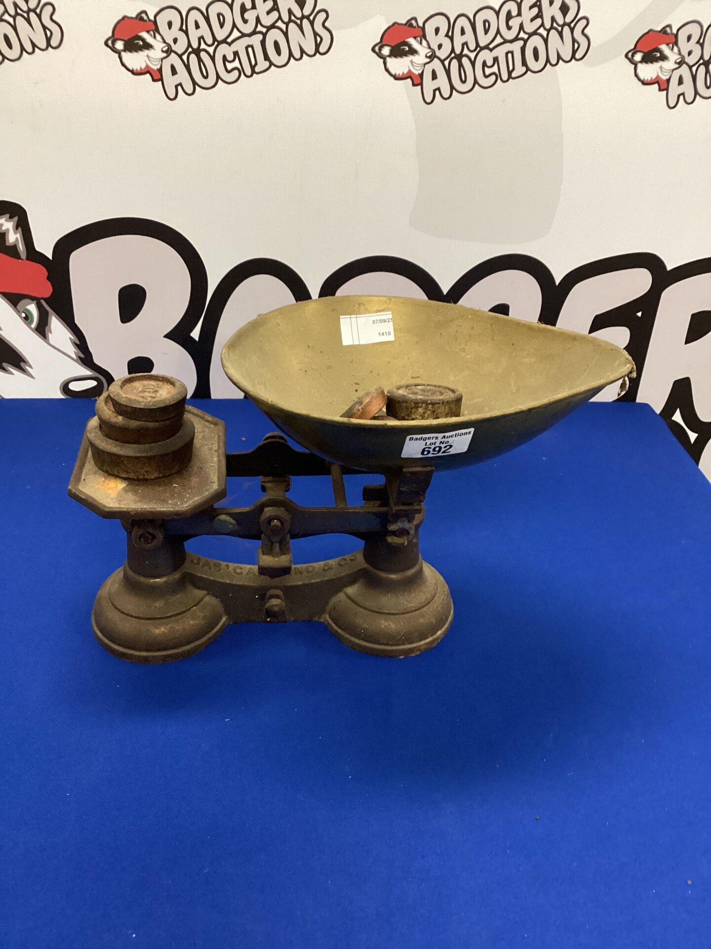 The scales show signs of age and use, with some surface rust and wear consistent with their age. However, this patina adds to their character and authenticity. These scales are a desirable collectible for enthusiasts of vintage kitchenalia, and would make a charming display piece or a functional addition to a retro-style kitchen. They represent a piece of domestic history and are sure to spark conversation.
