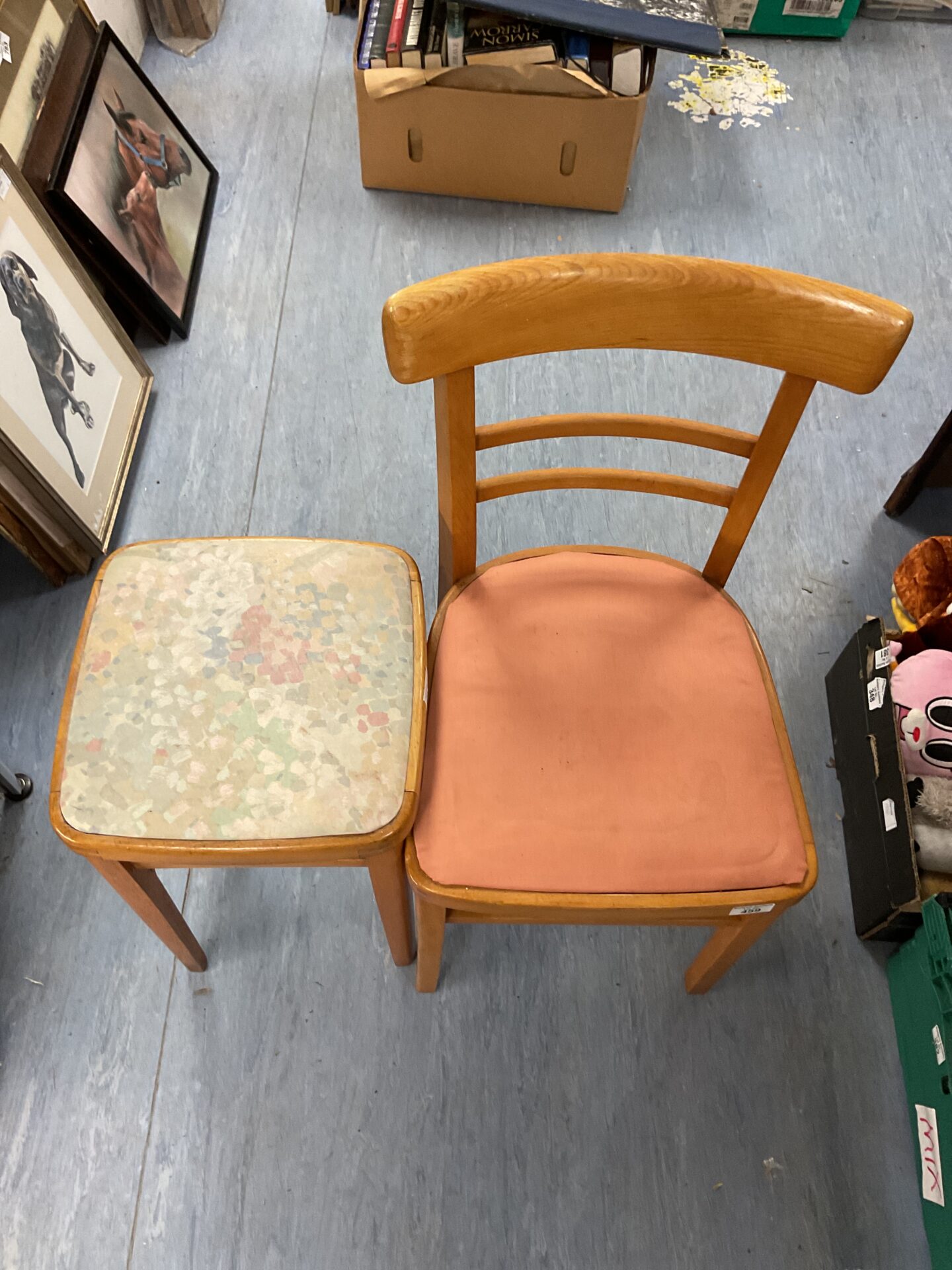 This is a vintage kitchen stool, likely dating to the mid-20th century. Constructed from wood, it features a simple, functional design typical of farmhouse or country kitchen furniture. The seat is covered in a patterned fabric, adding a touch of colour and character. This stool would have been used for seating at a kitchen table or counter, and its sturdy construction suggests it was built to withstand daily use.