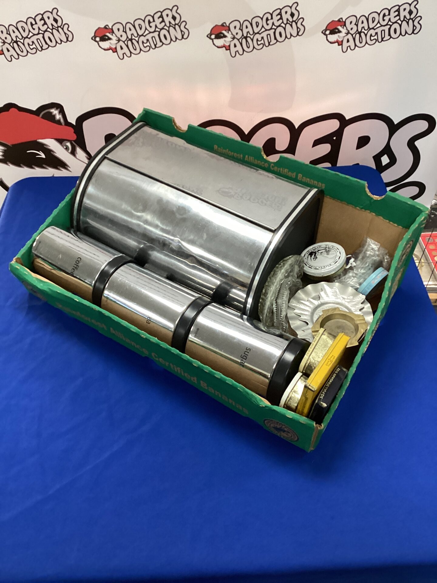 The items exhibit signs consistent with age and use, including surface wear and possible minor imperfections. Despite this, the set remains a desirable piece for collectors of vintage kitchenalia or those seeking to add a retro touch to their home. The complete set offers a unique opportunity to own a piece of kitchen history.