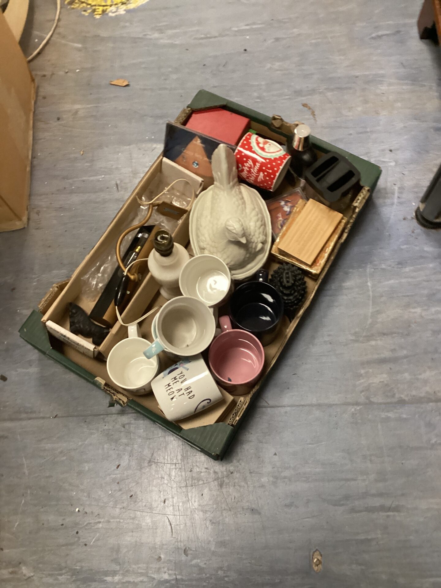 802 Tray Of Mixed Kitchen Ware Including Mugs And Egg Basket