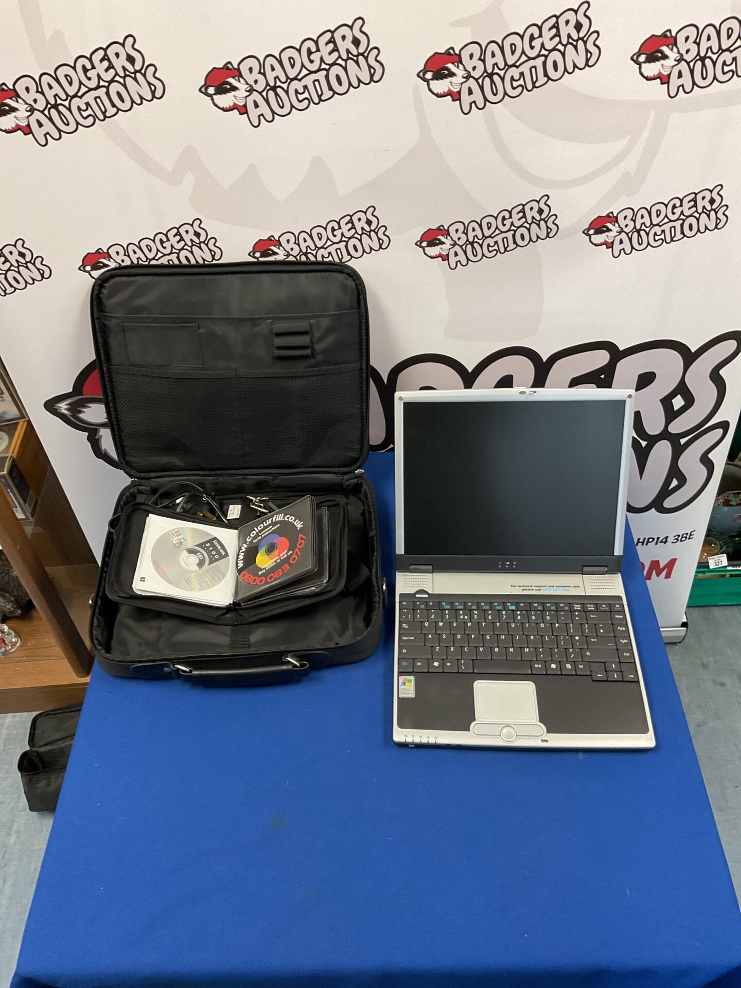 This is a vintage Time laptop, model 8081. It is a portable computer from the Windows XP era, complete with a carry bag and a case of software discs. The laptop features a classic design typical of early 2000s computing, offering a nostalgic glimpse into the evolution of personal computing.