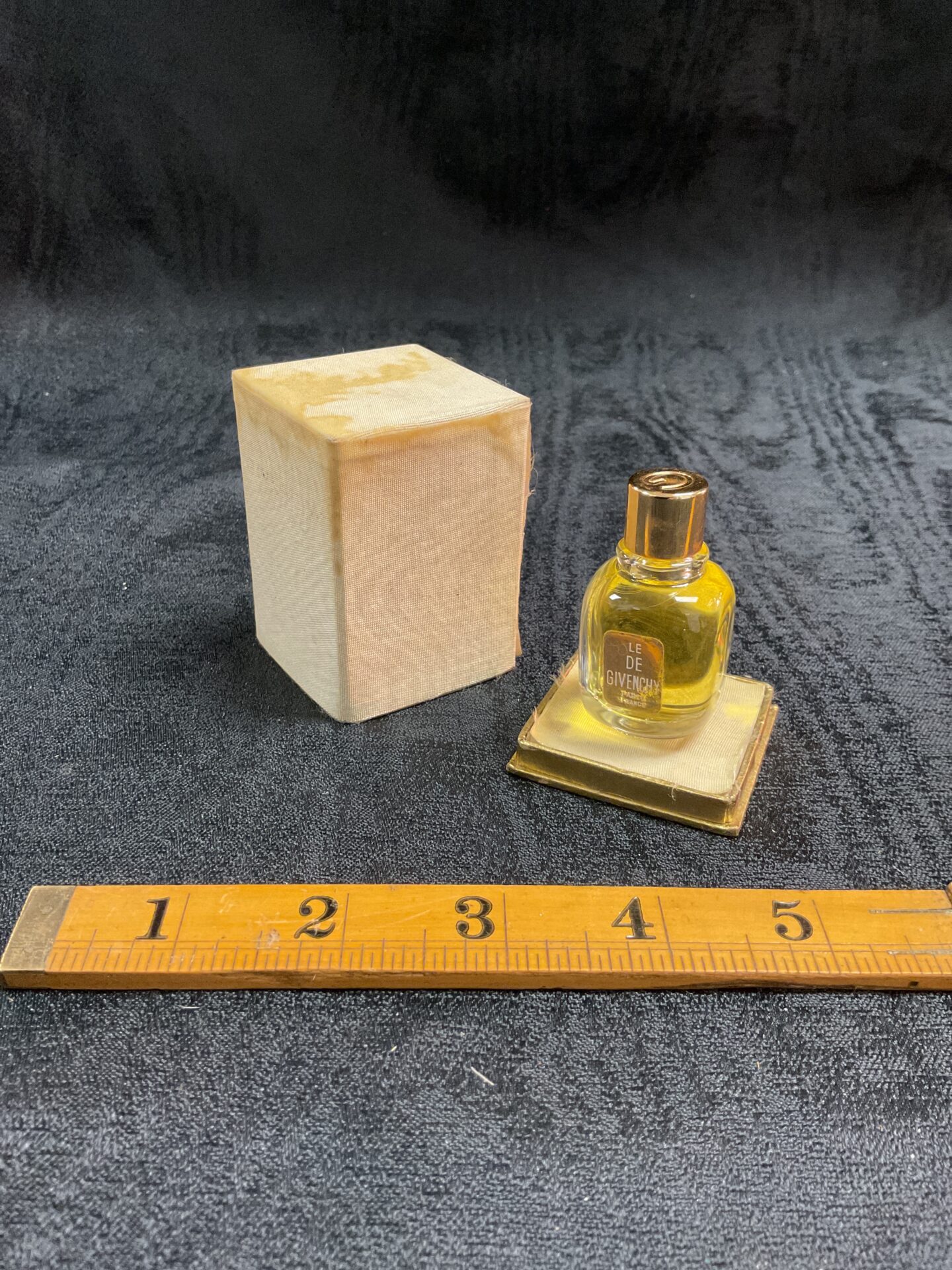 This is a vintage bottle of Le De Givenchy perfume. The petite glass bottle features a classic design, indicative of the mid-20th century aesthetic. The bottle is presented with its original box, adding to its charm and collectibility. It’s a delightful piece of fragrance history, showcasing the elegance of the Givenchy brand.