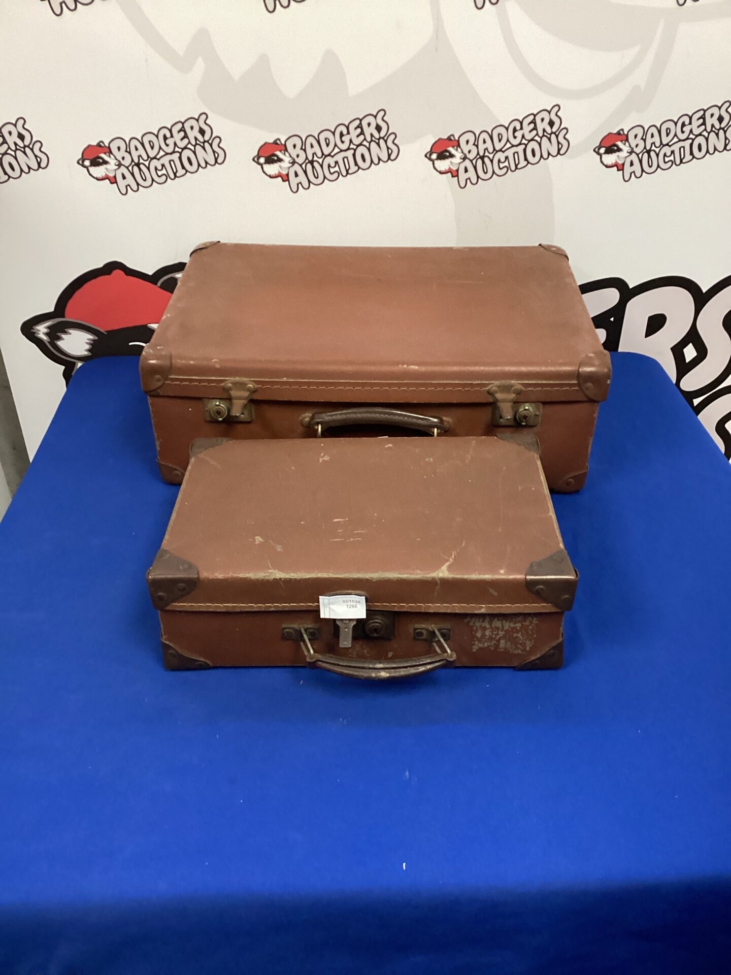 Both briefcases show signs of age and wear consistent with their vintage status. The leather exhibits patina and may have minor scuffs or marks. These imperfections contribute to their character and authenticity. Collectors and enthusiasts will appreciate the unique style and materials, making these briefcases desirable additions to a vintage luggage collection or as decorative pieces.