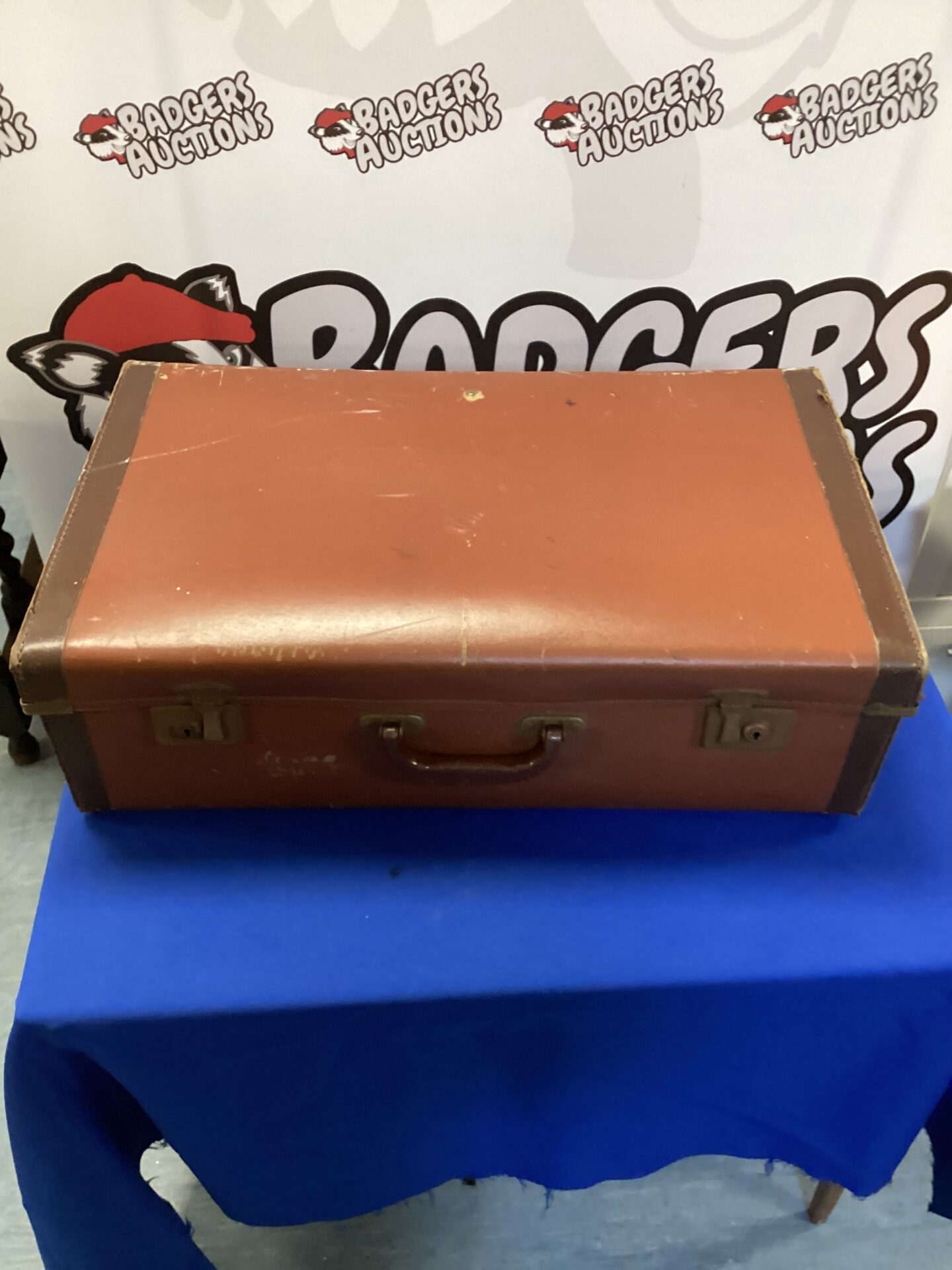 This is a vintage leather travel case, likely dating from the mid-20th century. The case features a sturdy construction with a rich brown leather exterior. It has metal corner protectors and a robust handle, suggesting it was designed for durability and frequent travel. The interior is lined with a patterned fabric, offering protection for its contents.