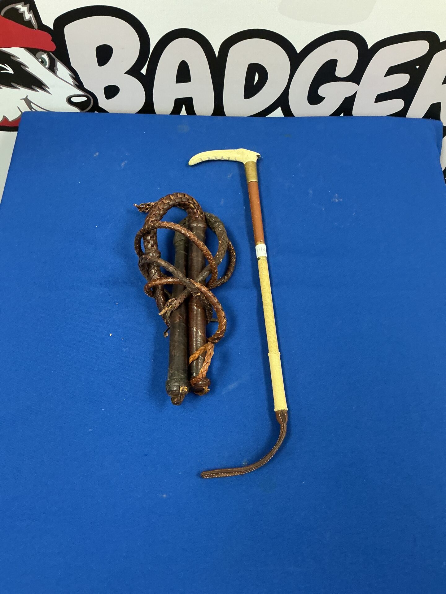 These whips and crop exhibit signs of age and use, with some wear and patina to the leather, which adds to their character. They appear to be largely original, with no obvious repairs or replacements. These pieces would be of interest to collectors of equestrian memorabilia, vintage sporting goods, or those simply seeking a unique decorative item with a rich history.