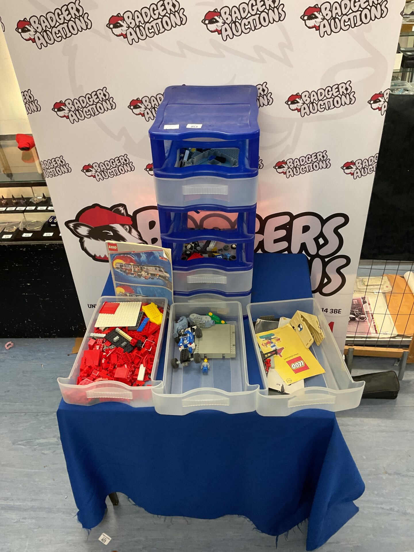 The Lego pieces are presented within a well-used storage case, showing signs of wear consistent with age and play. The condition of the individual bricks varies, with some showing minor wear and tear. This lot will appeal to Lego enthusiasts, collectors of vintage toys, and those seeking a creative building resource.