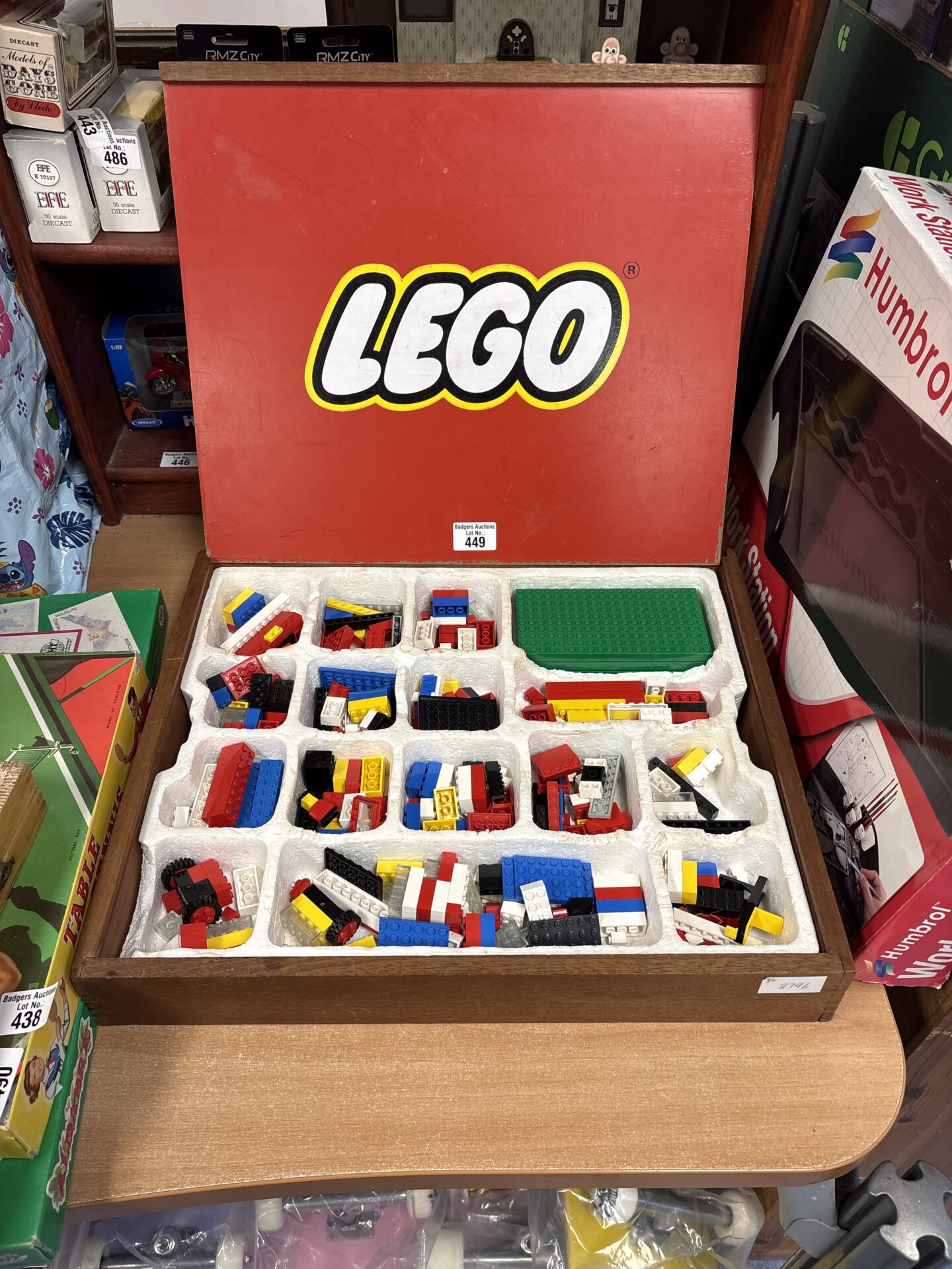 The case and its contents exhibit signs of age and use, consistent with being a vintage item. While the bricks are present, their quantity and completeness are not assessed. This lot will appeal to Lego collectors, vintage toy enthusiasts, or those seeking a nostalgic piece of their childhood.