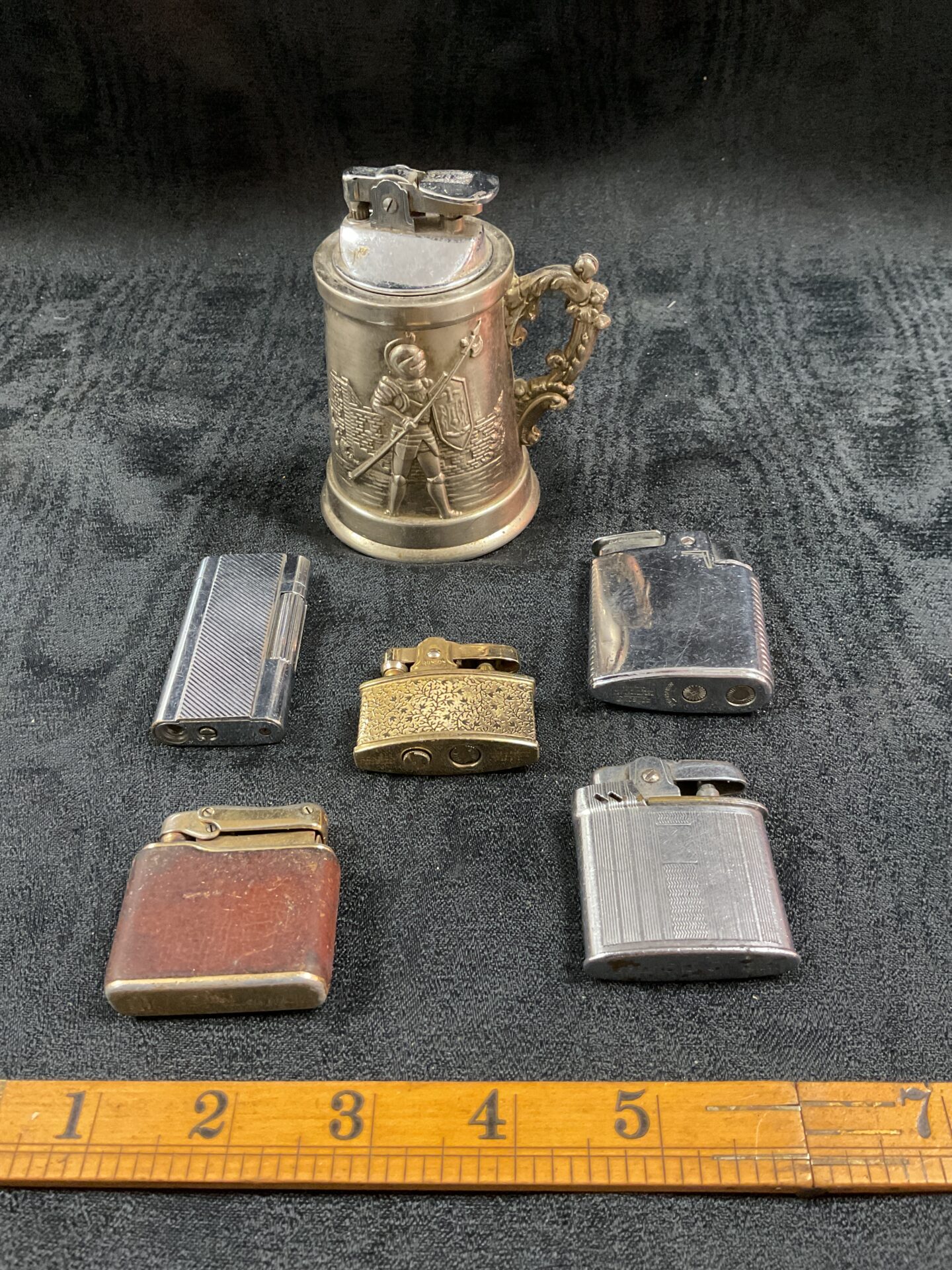 This lot comprises five vintage lighters alongside a decorative table lighter. The collection features examples from well-known brands such as Colibri and Ronson, showcasing a variety of styles and designs typical of mid-century smoking accessories. The table lighter is particularly notable for its ornate detailing, adding a touch of elegance to the collection.