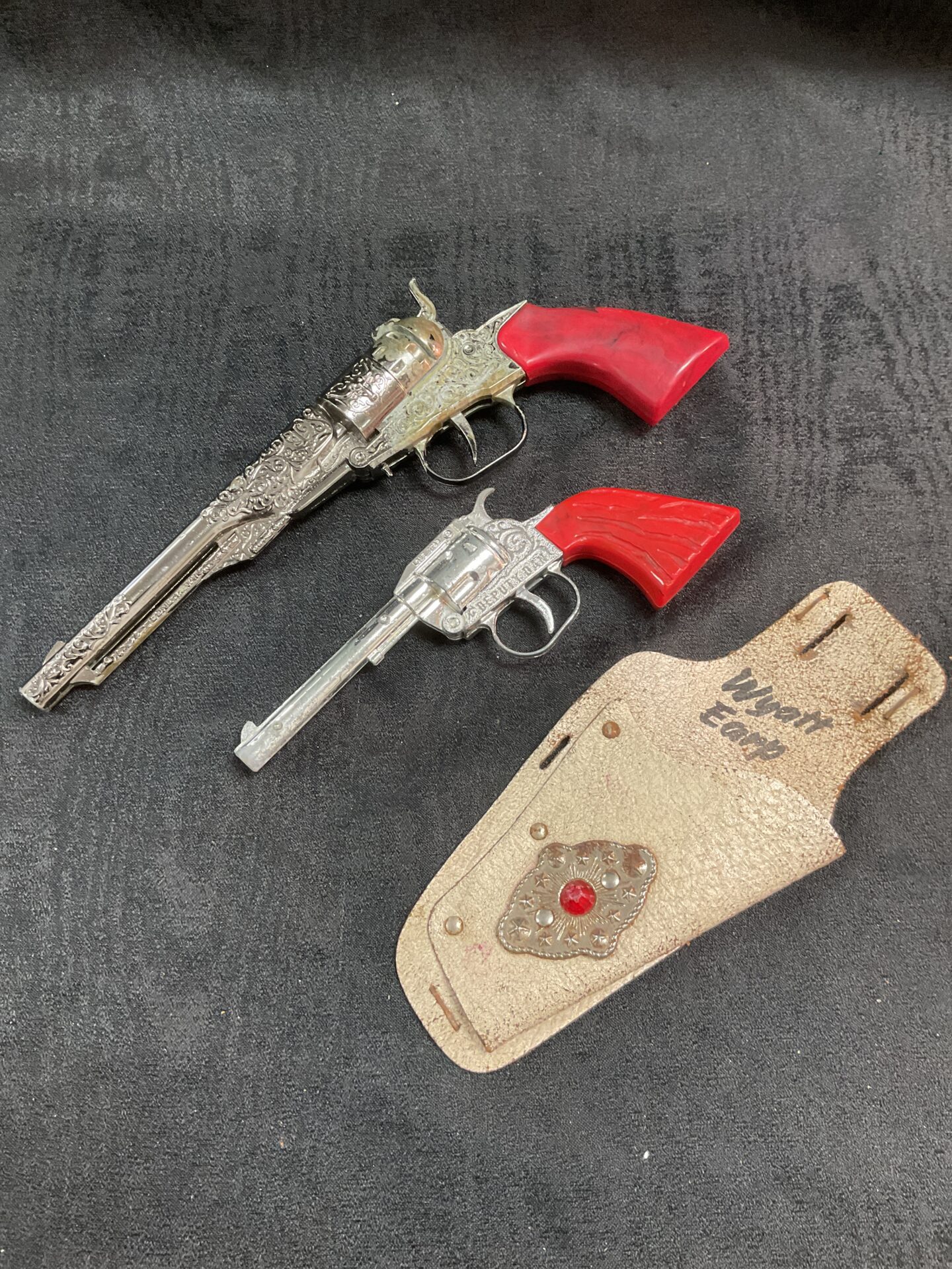 This lot features two vintage Lone Star cap guns, evocative of classic Western toy weaponry. These guns are constructed with detailed metal finishes and feature simulated wood-grain grips, adding to their authentic appearance. Included is a Wyatt Earp style holster, completing the set and allowing for imaginative play or display.