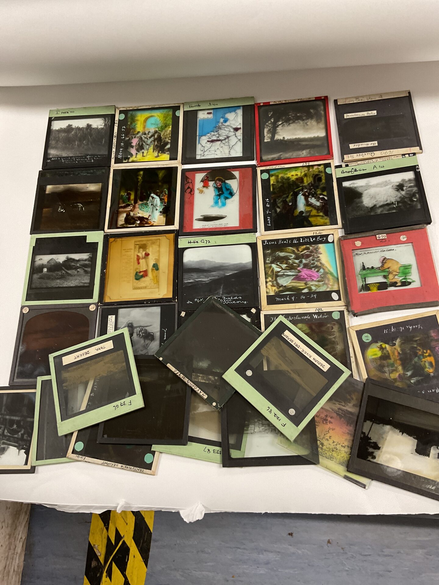 This lot comprises a collection of vintage magic lantern glass slides, dating likely to the late 19th or early 20th century. The slides feature a variety of subjects, including black and white and colour images, suggesting use for educational or entertainment purposes. These slides would have been projected using a magic lantern, an early type of projector, creating enlarged images on a screen for an audience.