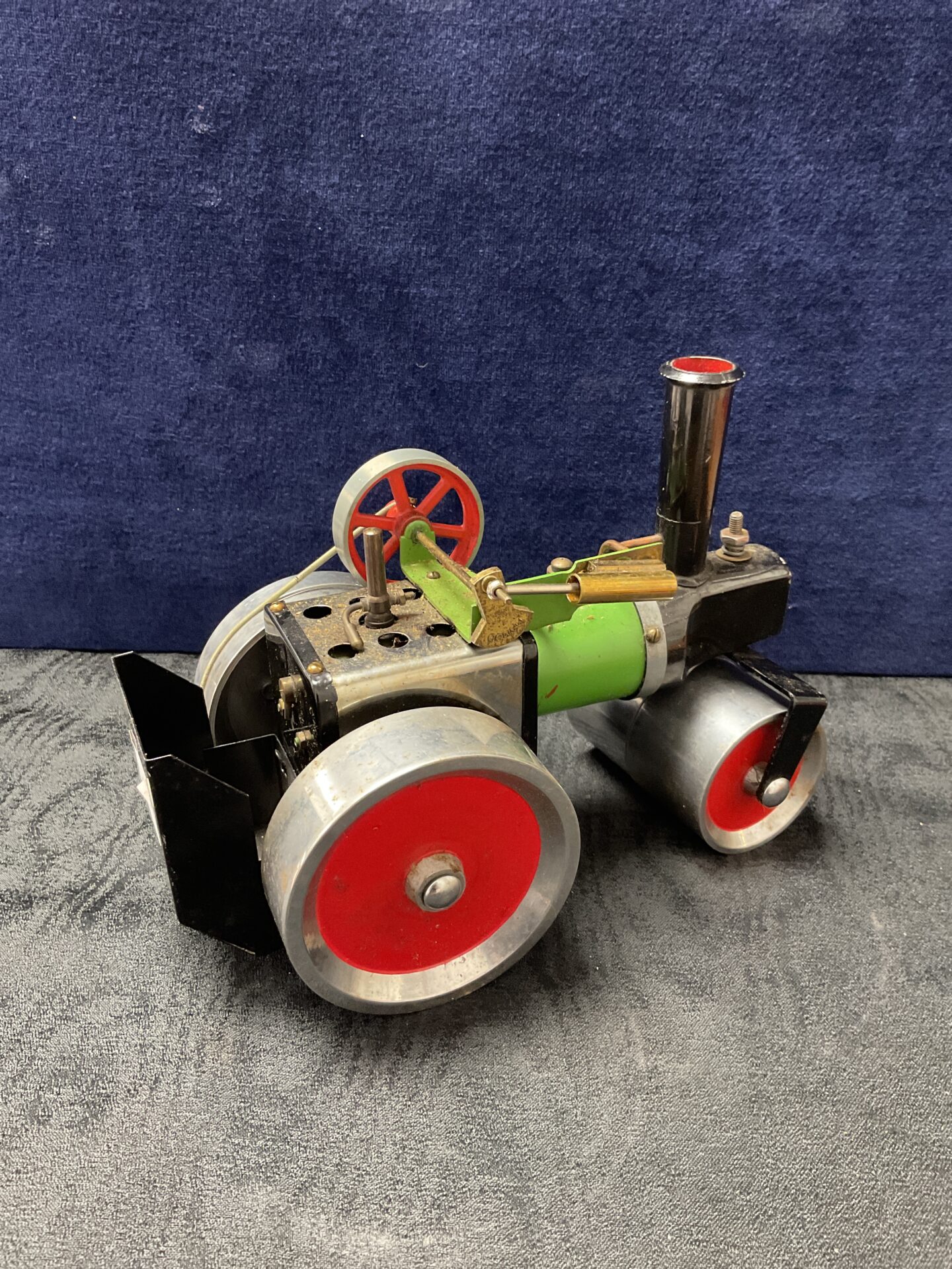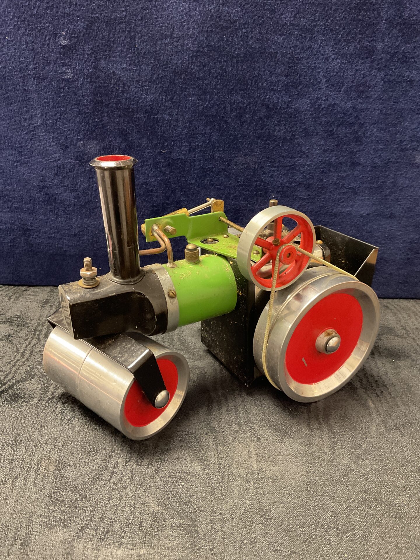 This Mamod steam roller appears to be in good vintage condition, displaying the expected signs of age and wear. It would make a fantastic addition to any collection of vintage toys or steam engines. Its working firebox and detailed construction make it a desirable piece for both display and potential operation, appealing to collectors and hobbyists interested in preserving a piece of engineering history.