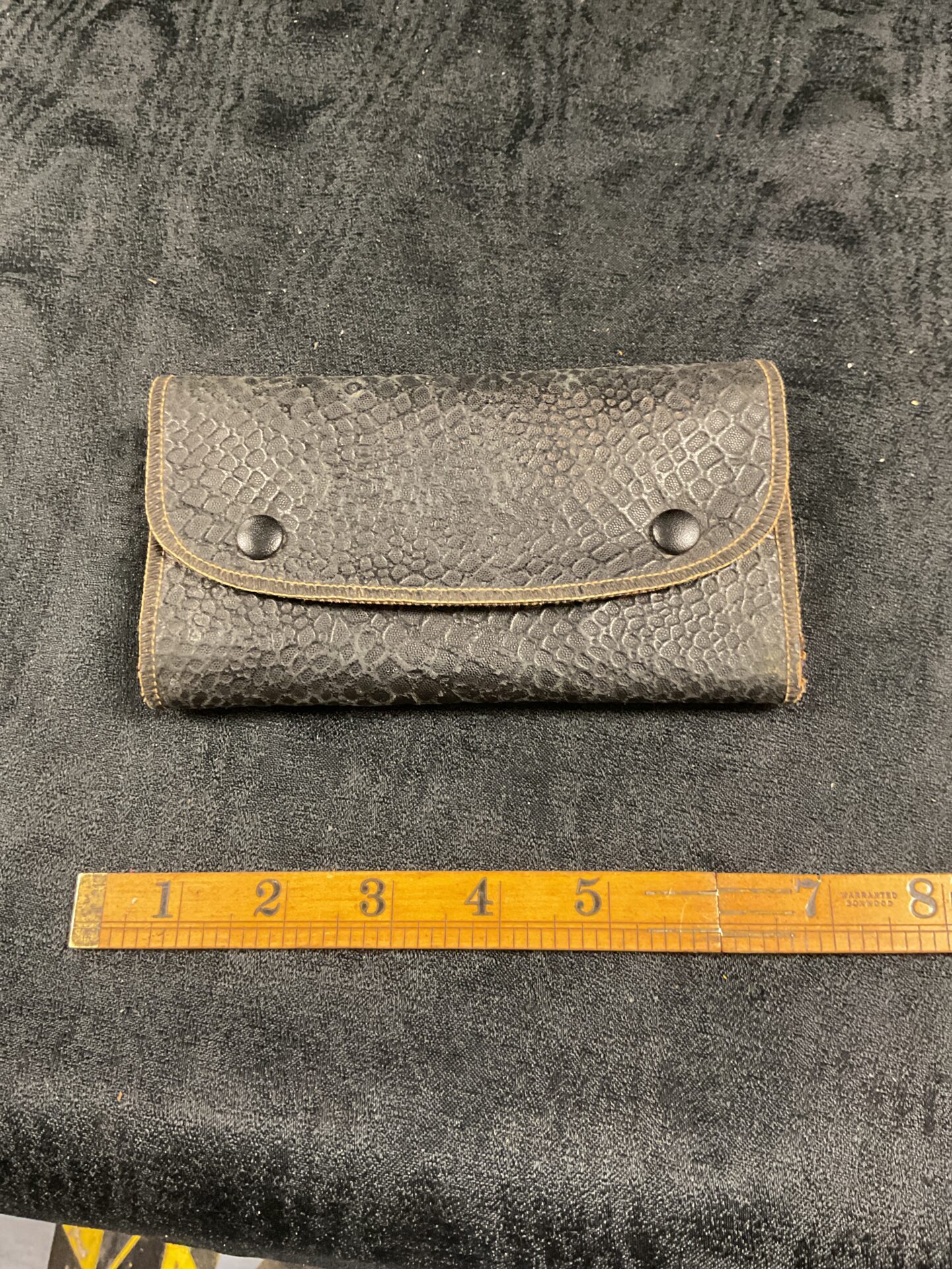 This manicure set shows signs of age and use, consistent with its vintage nature. The leather case exhibits wear and some fading, while the metal implements may show minor oxidation or patina. Despite this, the set remains a charming example of antique grooming accessories, appealing to collectors of vintage beauty tools or those seeking a unique and stylish travel manicure kit.