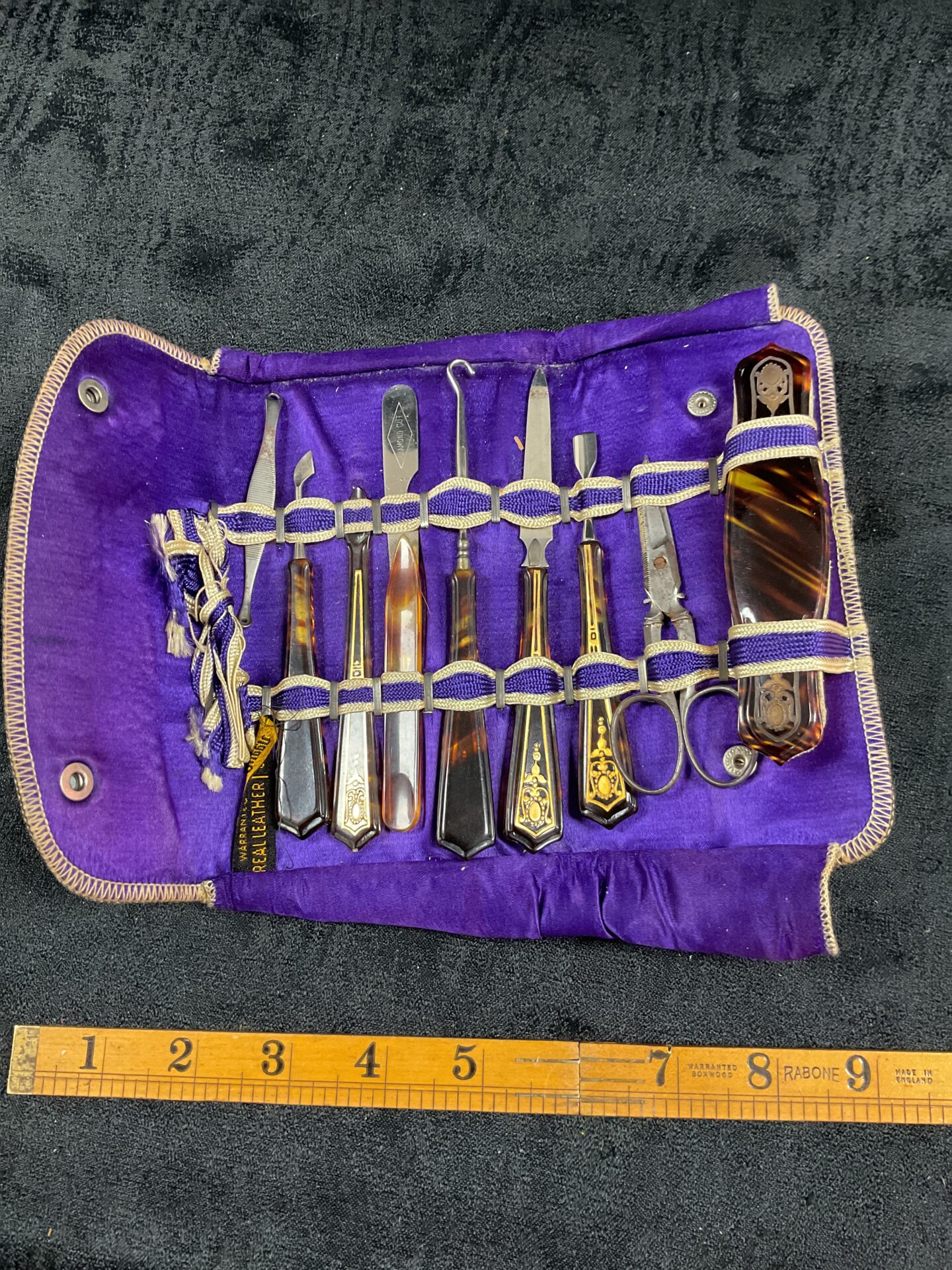 This vintage manicure set features a deep purple, real leather case with faux tortoise shell detailing. The set includes a variety of steel implements with matching handles, perfect for travel or display. A charming piece for collectors of vintage beauty tools and grooming accessories.