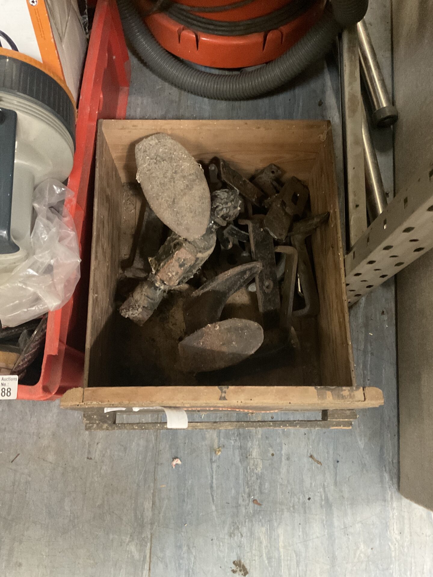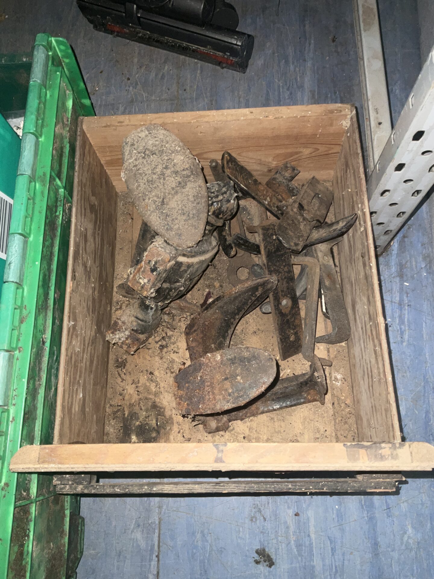 This lot comprises a collection of vintage metal items, including what appear to be shoe lasts and various other metal tools. The pieces exhibit a robust construction typical of older metalwork, suggesting they were designed for practical use in a workshop or trade environment. The variety of shapes and sizes indicates a diverse range of applications, potentially spanning shoemaking, leatherworking, or general metal fabrication.