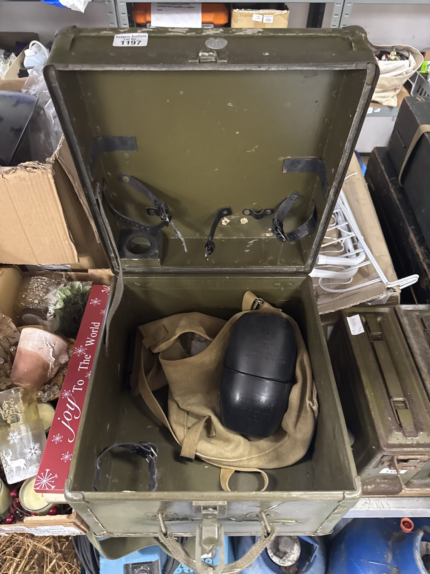 The box exhibits wear and tear, including surface rust and paint loss, which is typical for an item of this age and military origin. The canvas satchel and canteen are also well-used, showing signs of wear and patina. This box would be of interest to military collectors, history enthusiasts, or those seeking unique vintage storage solutions. It offers a glimpse into military life and provides a tangible piece of history.