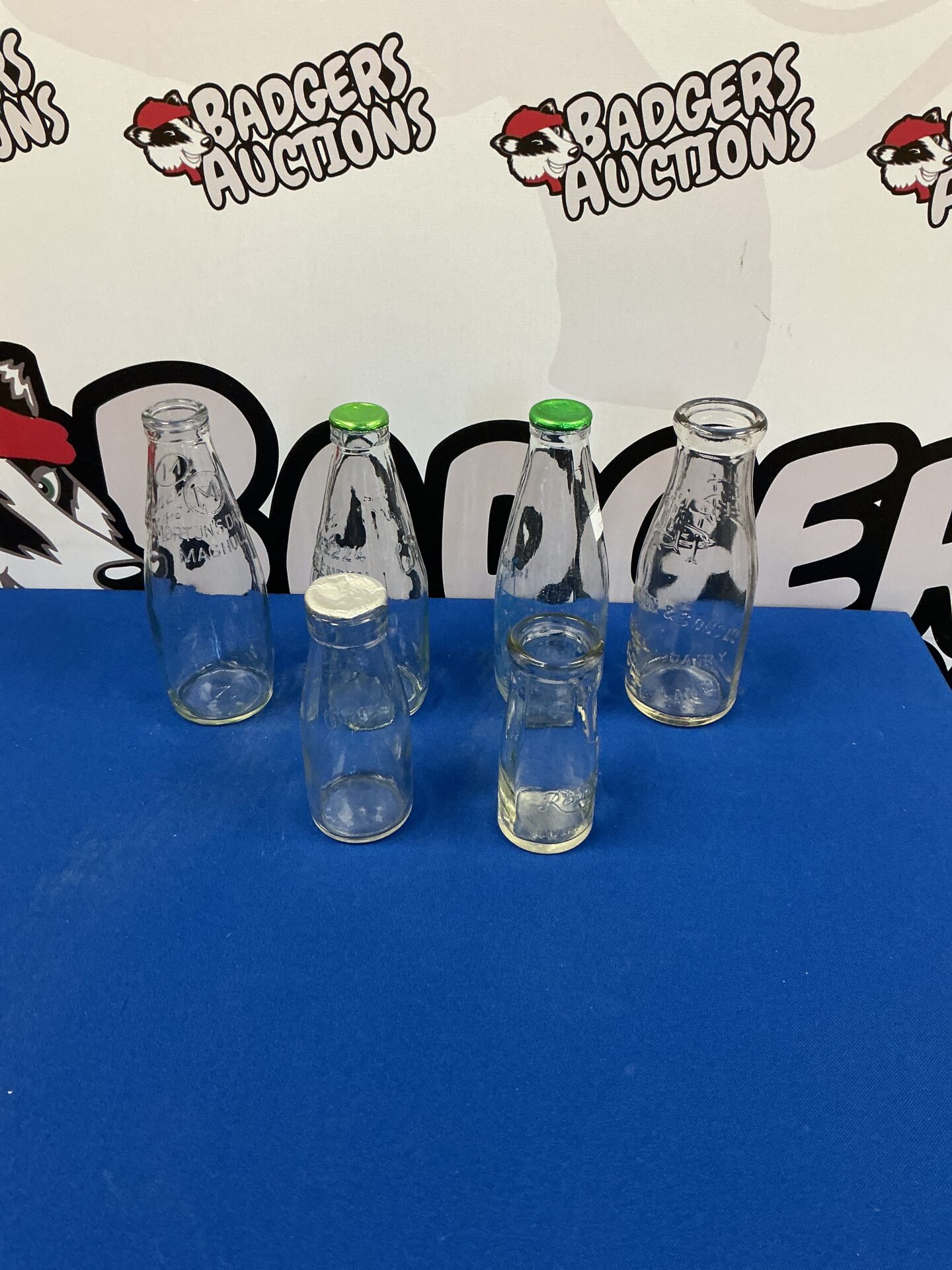 The bottles exhibit signs of age and use, with minor wear and tear consistent with their vintage. While not pristine, they retain their structural integrity and display a charming, weathered aesthetic. These bottles are highly sought after by collectors of vintage dairy memorabilia and would make a unique addition to any collection or display.