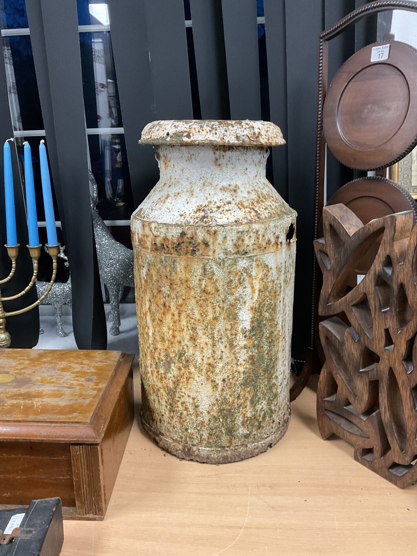 The milk churn exhibits significant signs of age and wear, including surface rust and areas of corrosion. This weathering is consistent with its age and use, and contributes to its authentic character. Despite this, the structure remains sound, and it presents a wonderful opportunity for restoration or to be left as a testament to its working life. Collectors of farm equipment, industrial antiques, or those seeking unique decorative pieces will find this churn particularly appealing.