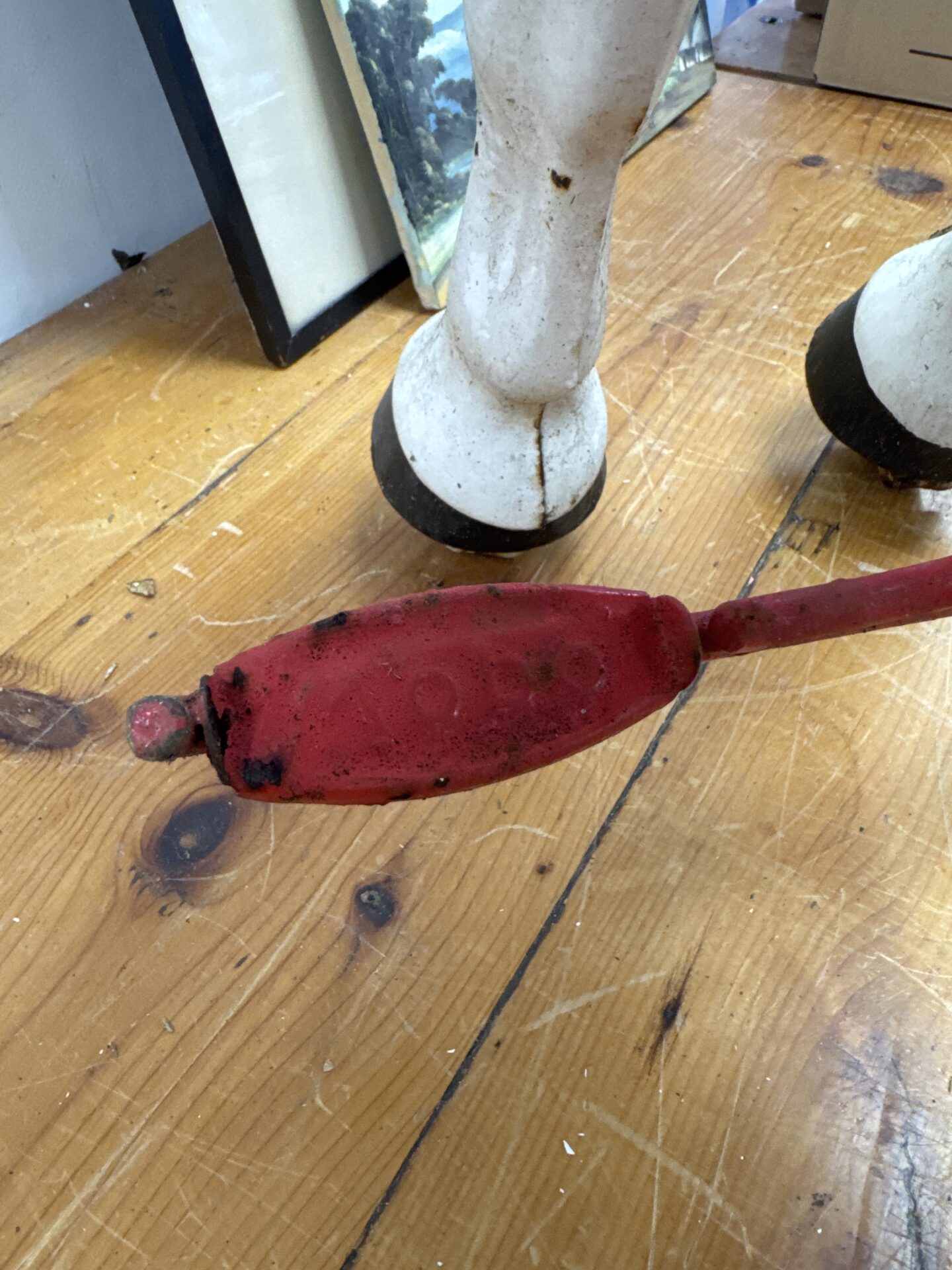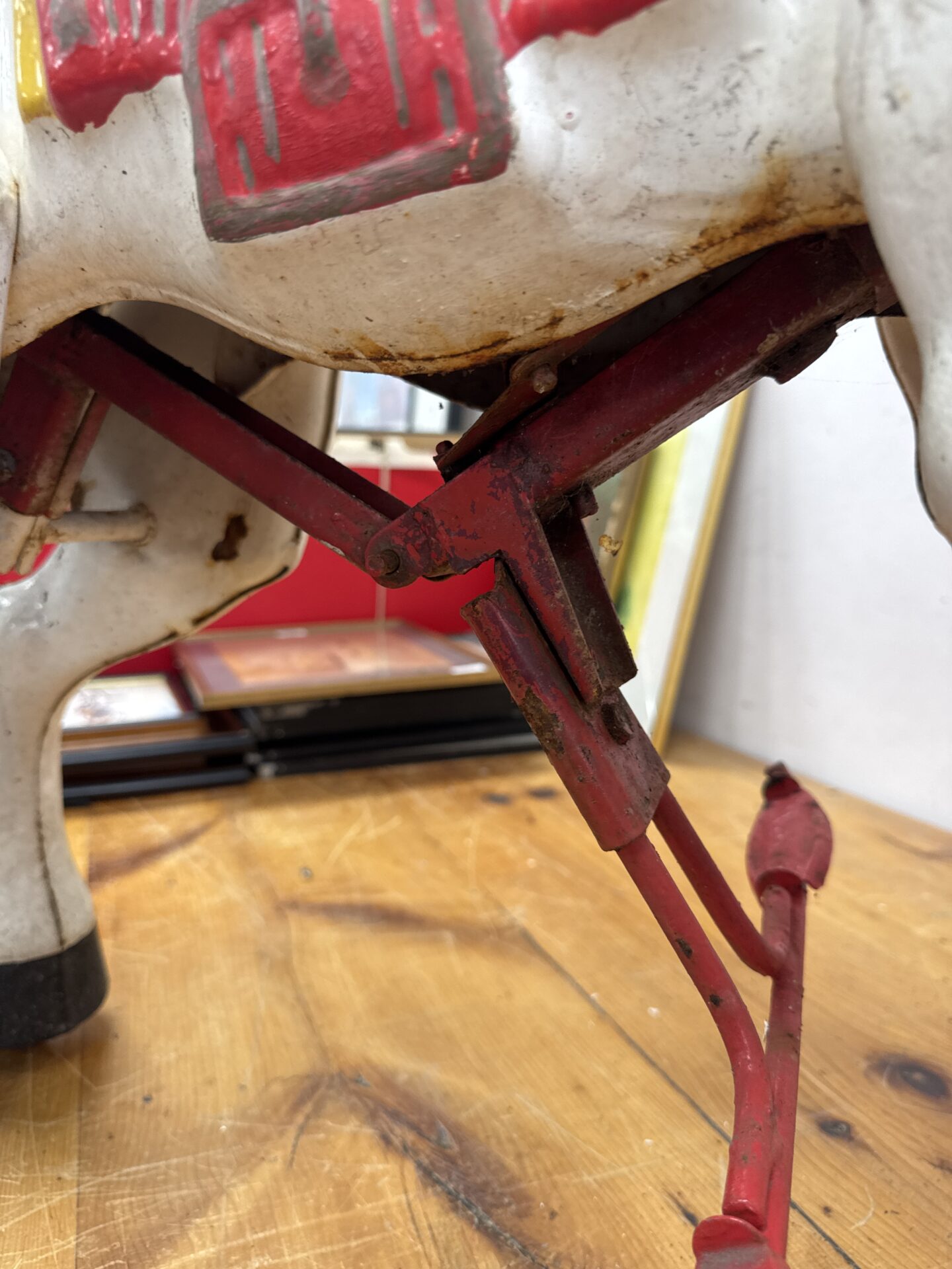 This Mobo ride-on horse shows signs of wear consistent with age and use, including some paint loss and minor surface rust, as visible in the images. Despite these imperfections, it remains a structurally sound and visually appealing piece. Its originality and nostalgic appeal make it a desirable item for collectors of vintage toys, and it would be a charming addition to any collection or a delightful display piece.