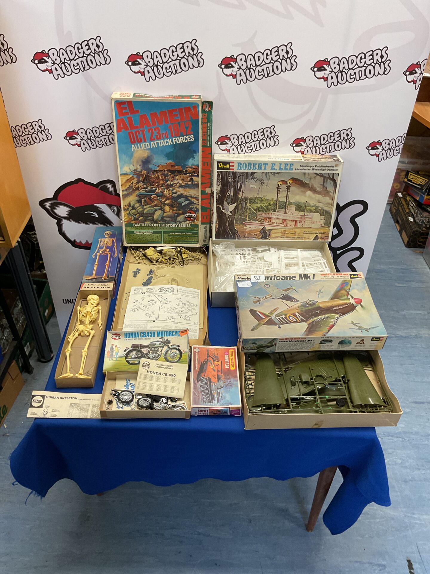 This lot features a selection of vintage plastic model kits from brands like Revell, Airfix, and Matchbox. These unbuilt kits offer a nostalgic glimpse into the past and are perfect for collectors or restoration projects. A great addition to any modelling enthusiast’s collection!