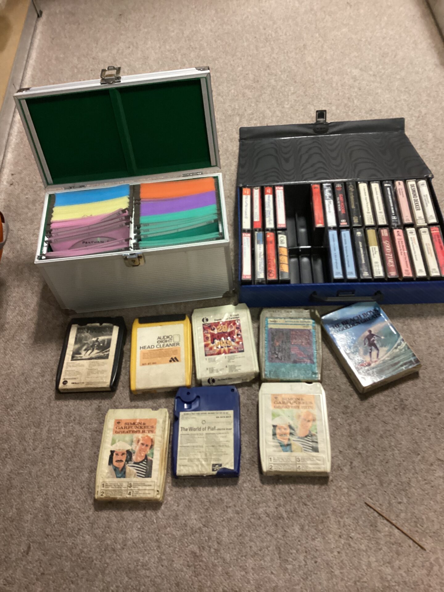 This lot comprises a collection of vintage music media, including eight-track tapes and cassette tapes. The collection is housed within a hard-sided carrying case, offering a glimpse into the era of portable music enjoyment. The variety of tapes suggests a diverse musical taste, and the case itself adds to the nostalgic appeal of this lot.
