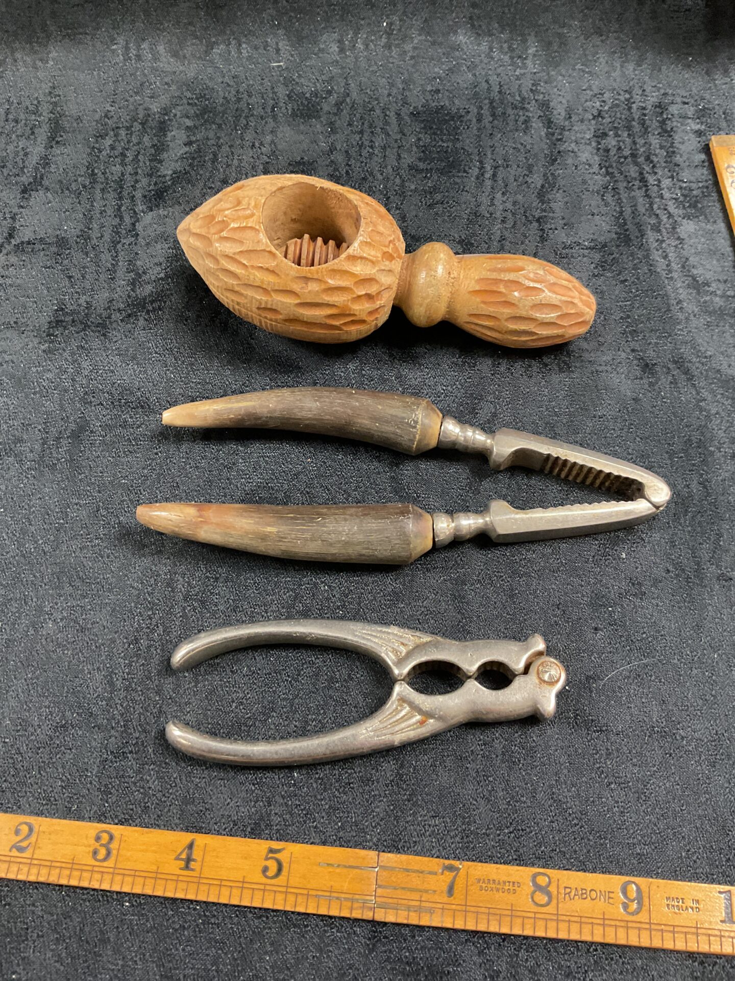 This lot comprises three vintage nut crackers, each with unique characteristics. One features a beautifully carved wooden body, likely fruitwood, showcasing skilled craftsmanship. Another cracker has a distinctive horn handle, providing a comfortable grip. The third cracker is of simpler construction, but still retains a charming vintage aesthetic. These tools offer a glimpse into a bygone era of kitchen implements.