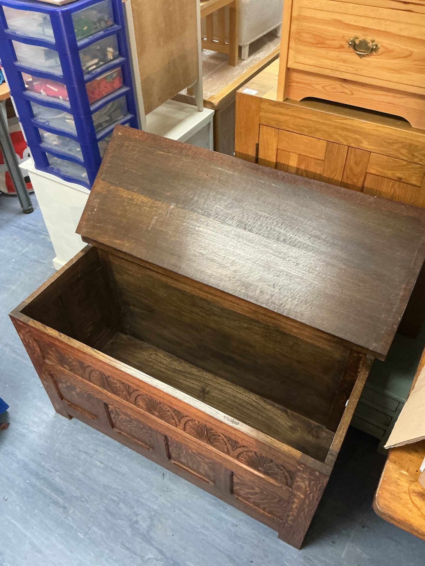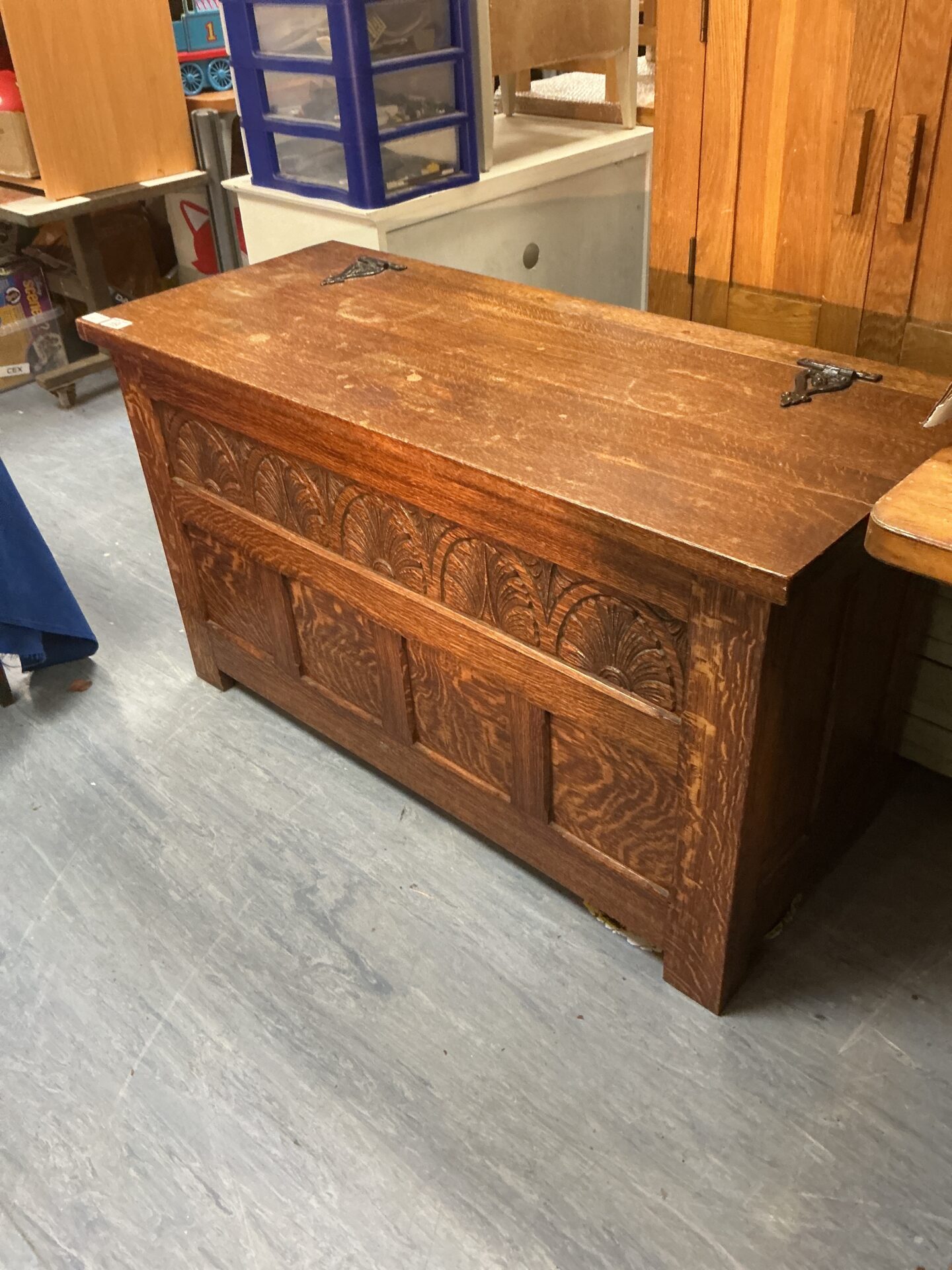 This is a vintage oak chest, measuring 42” x 18” x 24”. The chest features a solid oak construction with decorative carved detailing on the front panel. It presents a classic farmhouse or rustic aesthetic, ideal for adding character to any room.