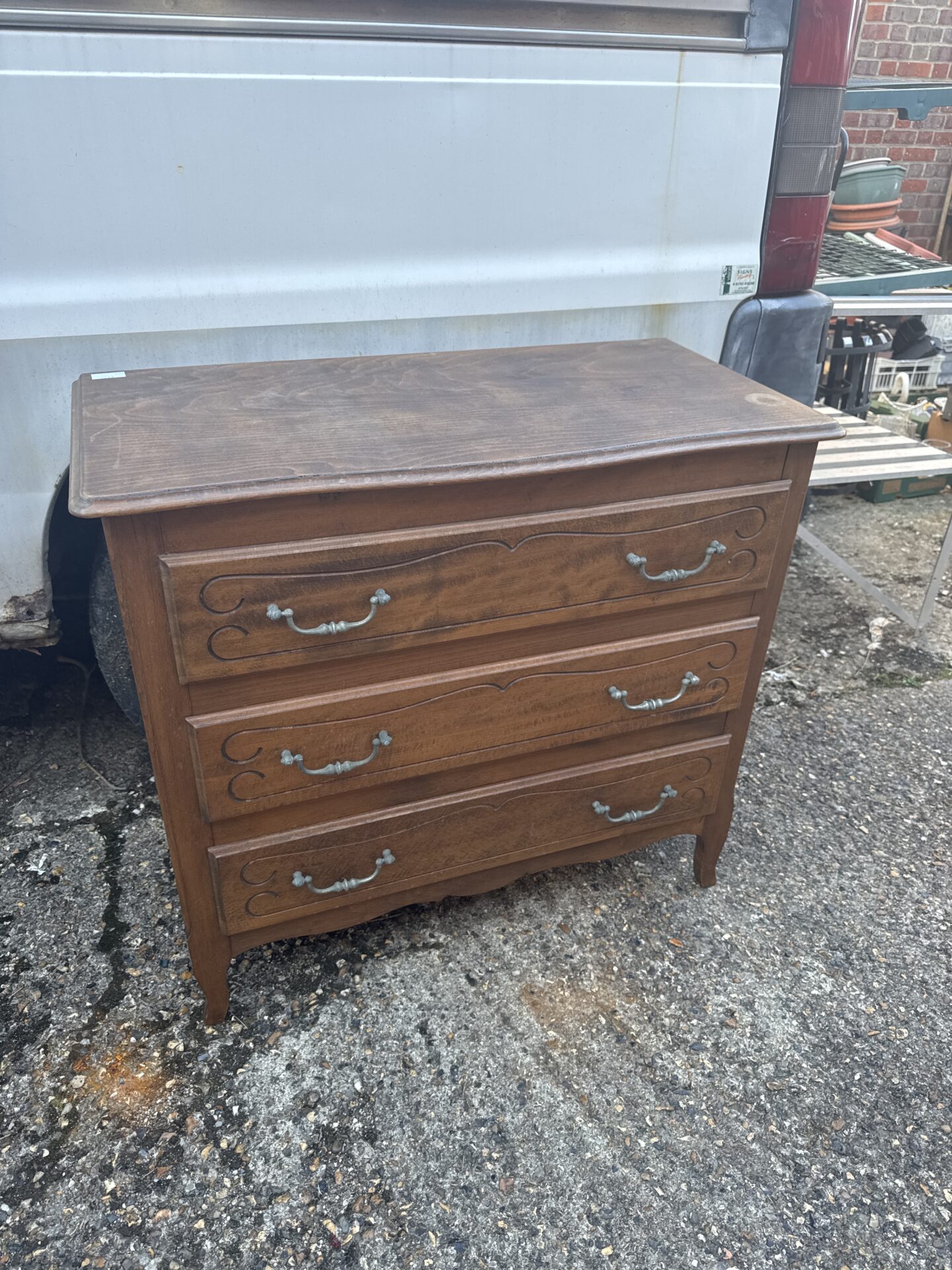 This charming vintage chest of drawers is crafted from solid oak, showcasing the warm tones and durability characteristic of post-war furniture. The cabinet features three spacious drawers, perfect for storing clothing or other household items. Its simple, classic design lends itself well to a variety of interior styles, from mid-century modern to farmhouse. The cabinet measures 33.5” in length, making it a versatile addition to bedrooms, living rooms, or hallways.