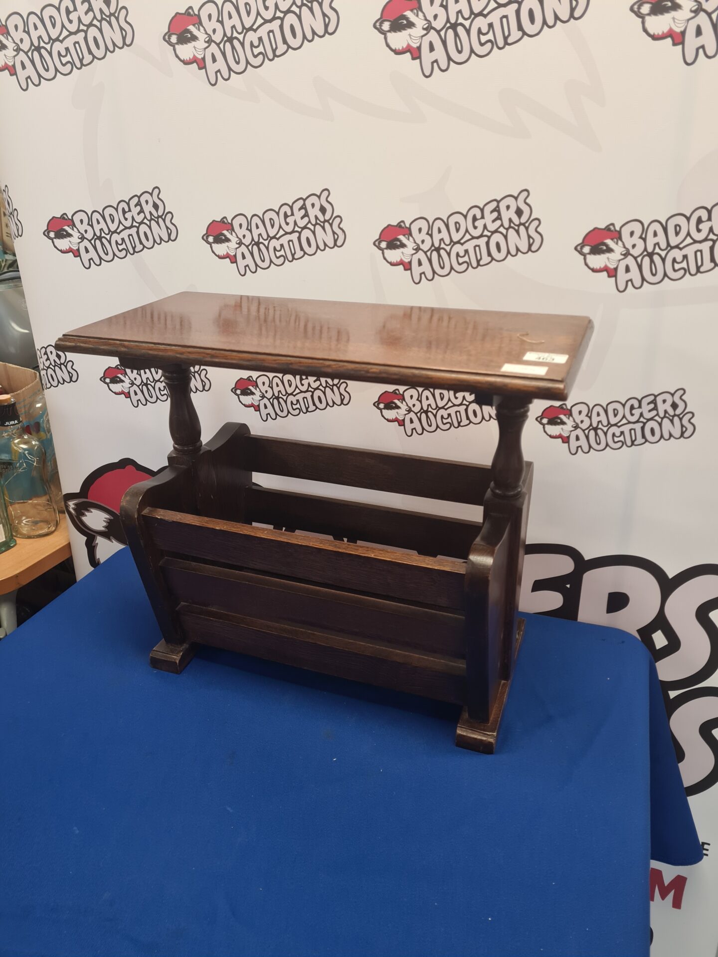 This magazine rack is in good vintage condition, exhibiting the expected signs of wear and patina consistent with its age. There may be minor scratches, dings, or variations in the wood grain, which only add to its character and authenticity. This piece would be a welcome addition to any collection of antique or vintage furniture, or a charming accent piece for those seeking a touch of rustic warmth in their home.