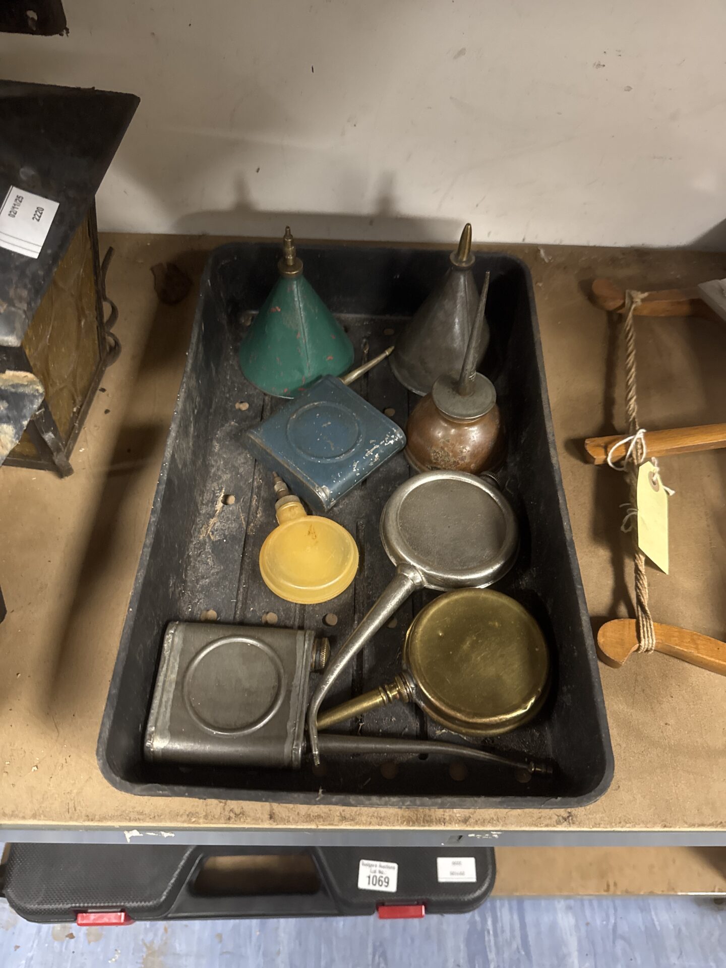 This lot features a selection of vintage metal oil dripper cans, ideal for collectors or as decorative workshop pieces. The cans exhibit signs of age and use, with varying colours and shapes, adding to their character. A charming addition to any collection of antique tools or garage memorabilia.