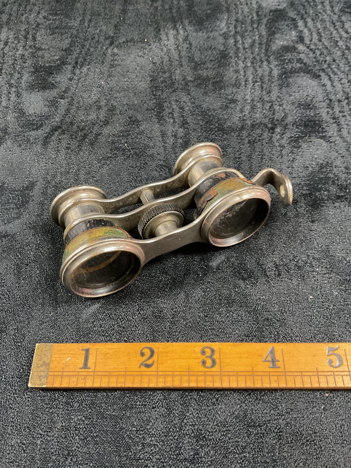 These opera glasses show signs of age and use, with some patina and wear to the brass finish. The lenses exhibit some clouding consistent with age, and the folding mechanism may not function as smoothly as when new. Despite this, they remain a charming collectible, appealing to those interested in antique optical instruments or theatrical memorabilia.