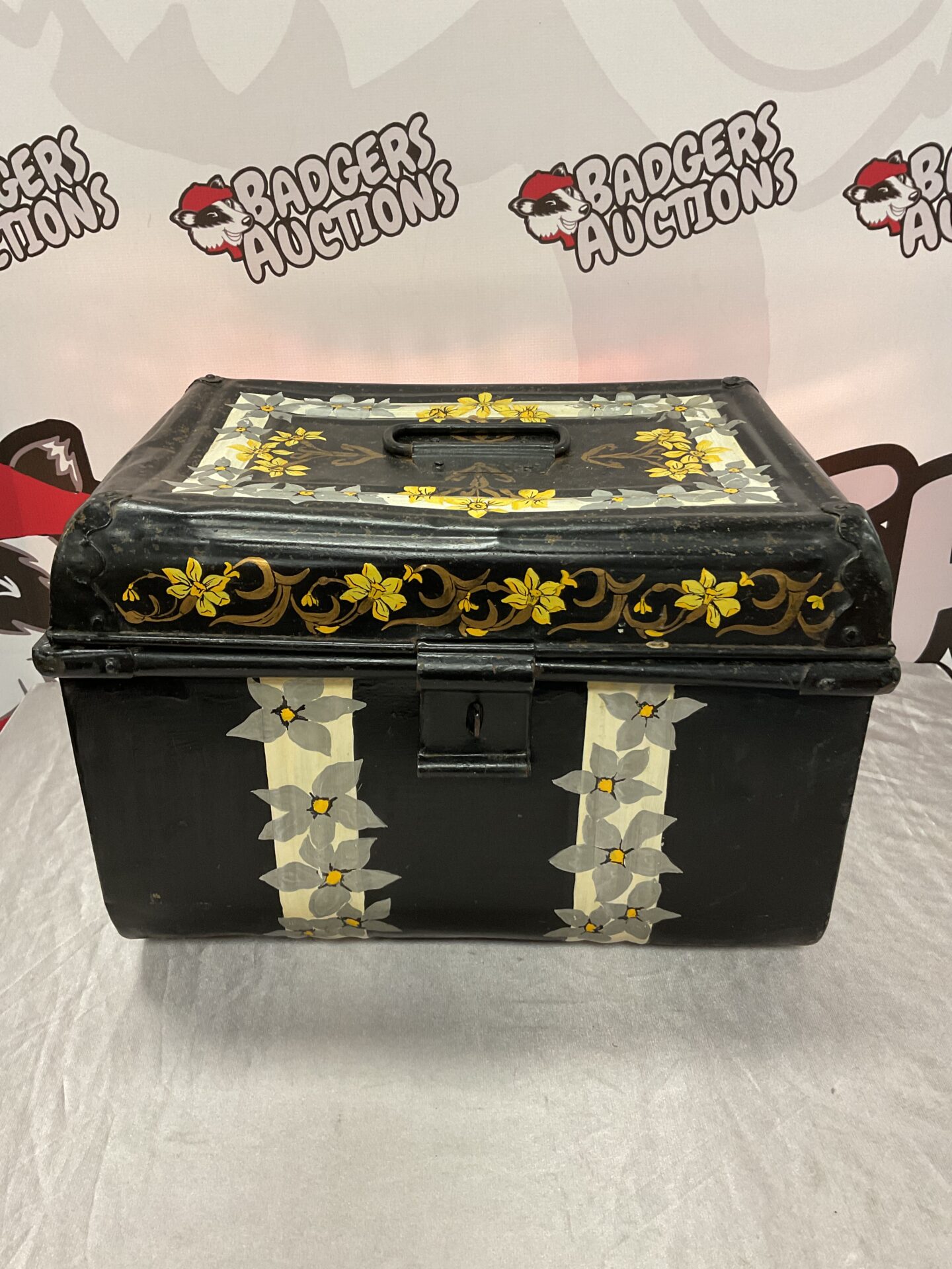 This is a vintage metal chest, beautifully hand-painted with a floral design. The chest features a hinged lid with a clasp closure and is constructed from metal, likely steel or iron. The hand-painted decoration adds a unique and artistic touch, suggesting it may have been a personal or commissioned piece. It’s a charming example of folk art and functional storage.