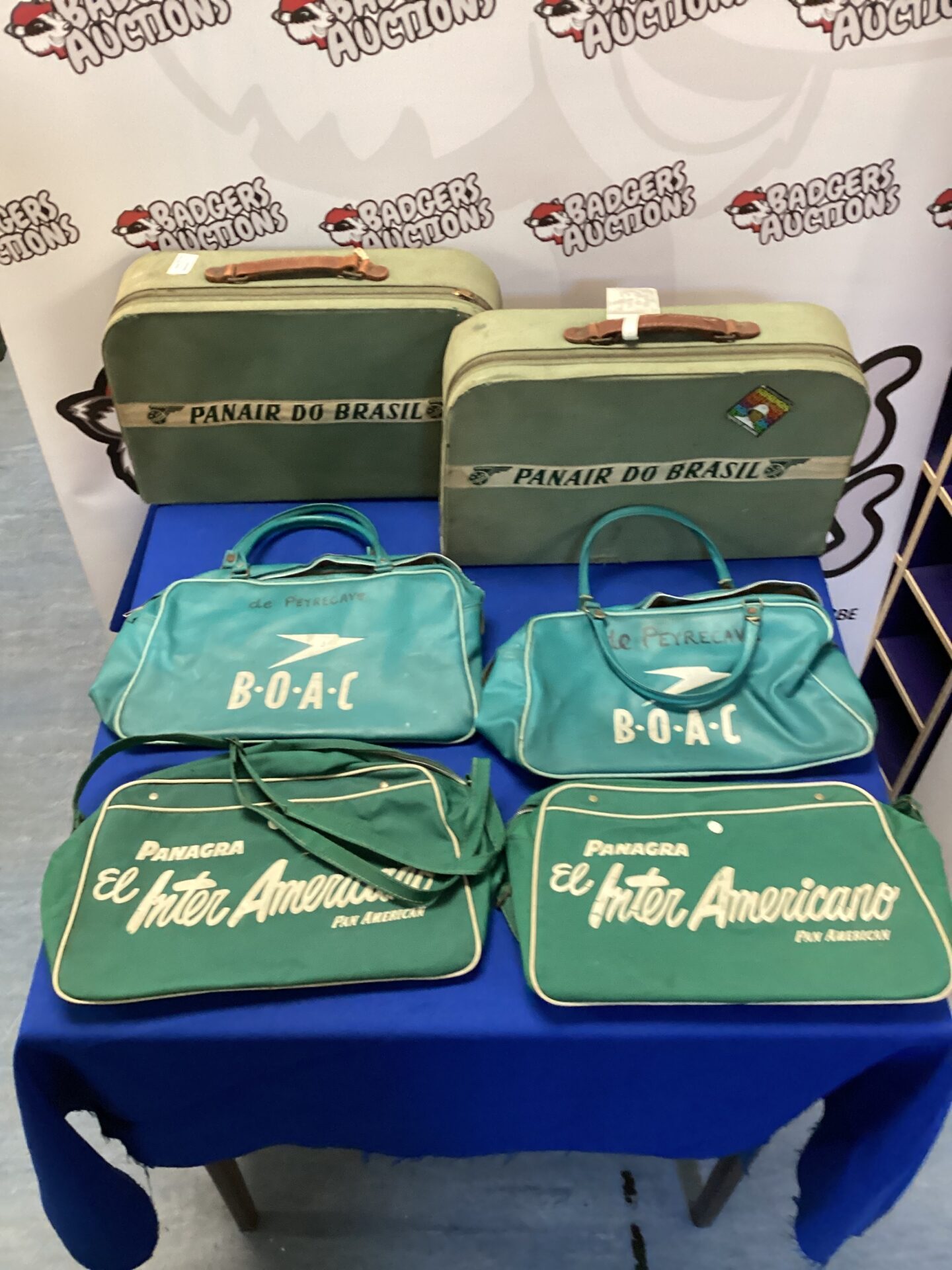 The luggage shows signs of wear consistent with age and use, including scuffs, marks, and fading to the materials. Despite this, the pieces remain structurally sound and retain their original branding and character. This lot would be of interest to collectors of vintage travel memorabilia, airline enthusiasts, or those seeking unique and stylish storage solutions with a touch of history.
