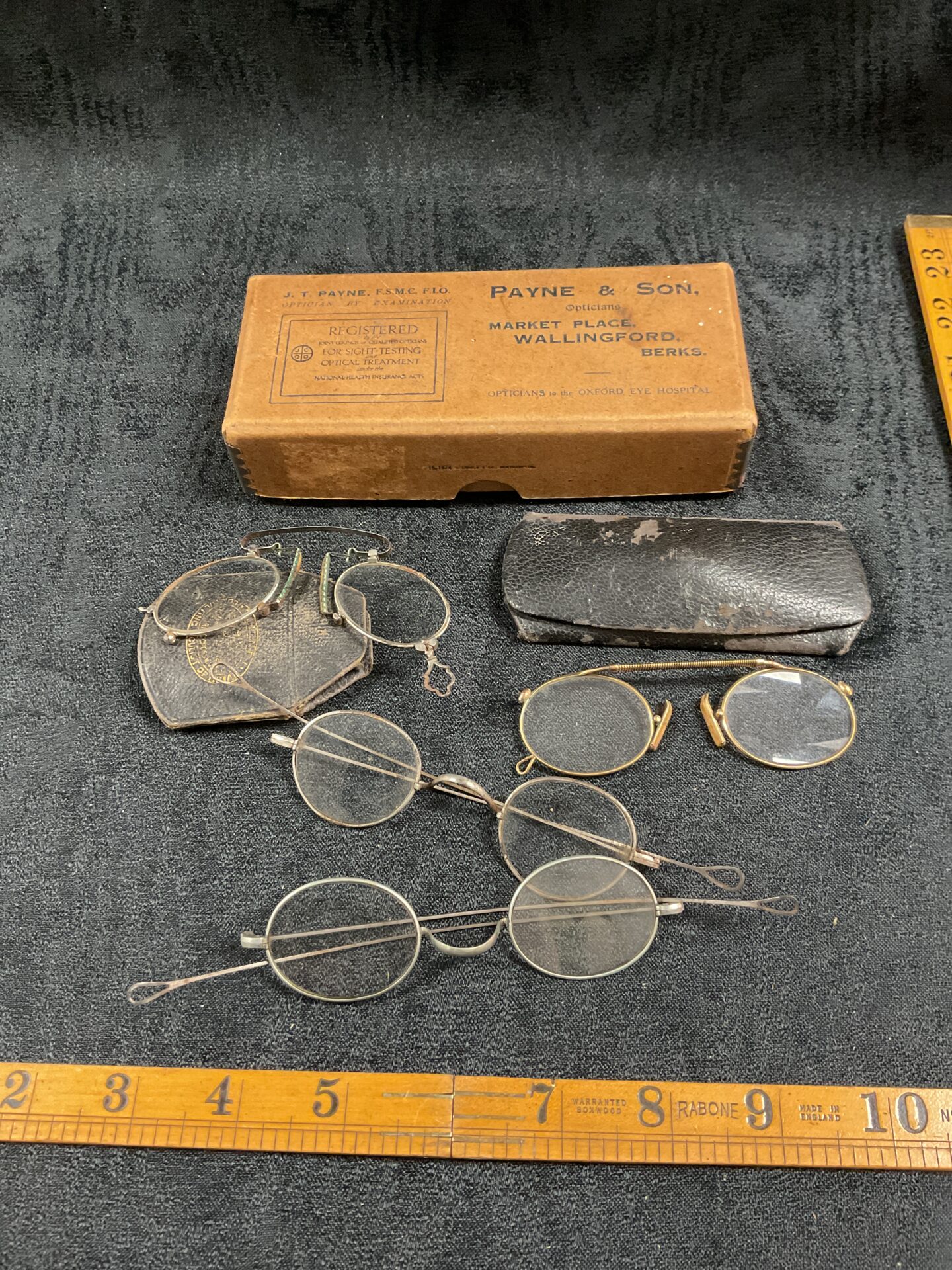 This is a fascinating example of early 20th-century eyewear, presented in its original Payne & Son, Wallingford box. The spectacles feature a delicate wire frame and appear to be designed for a refined aesthetic. The box itself is a wonderful piece of ephemera, bearing the company name and address, offering a glimpse into the history of optical practices.