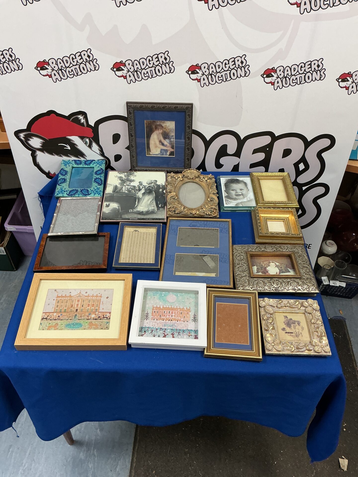 This lot comprises a diverse collection of vintage photo frames, showcasing a variety of styles and materials. The frames range in size, shape, and ornamentation, including gilded wood, embossed detailing, and various finishes. These frames likely date from the early to mid 20th century, offering a glimpse into the decorative tastes of past eras. They are ideal for displaying cherished photographs, artwork, or other small collectibles.