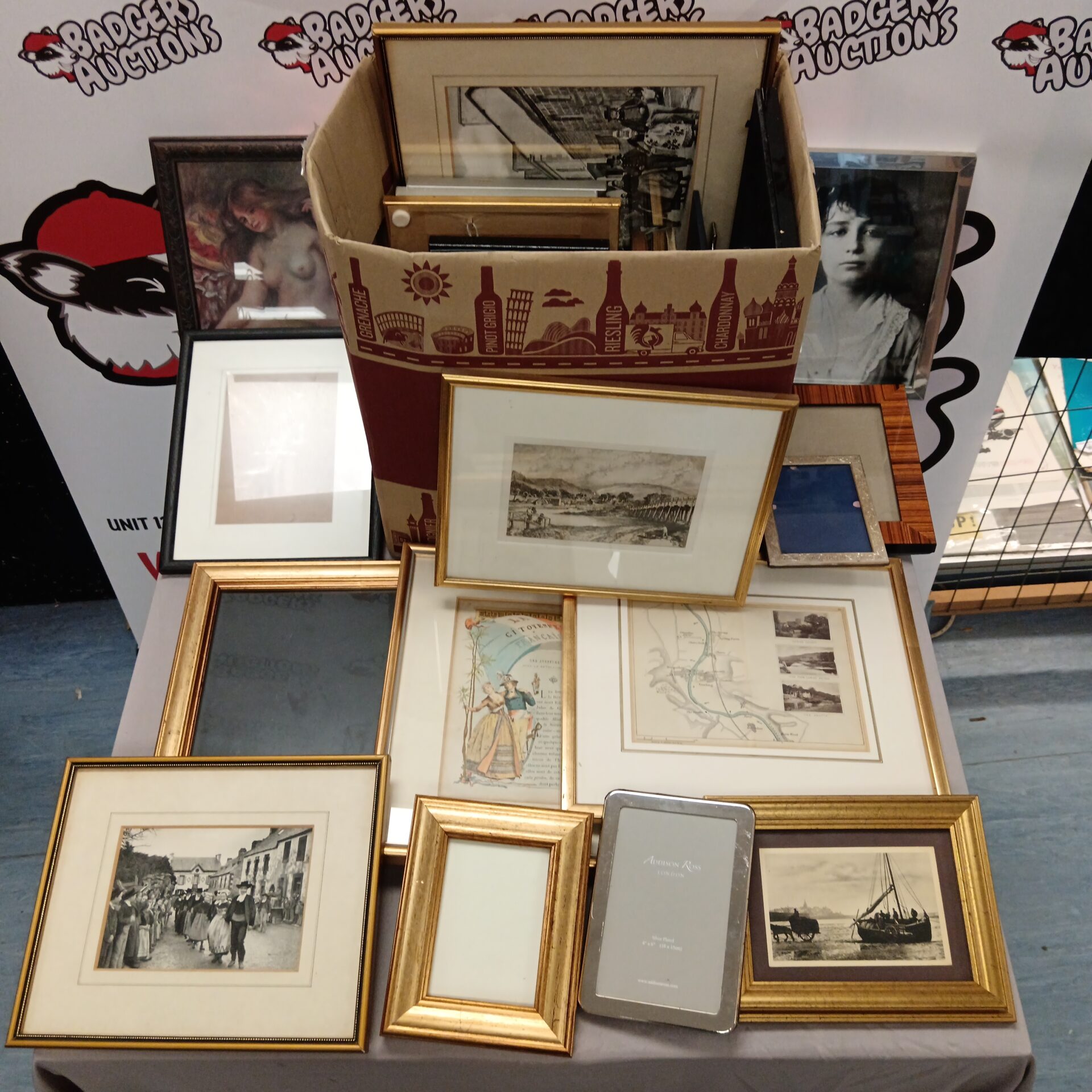 This lot comprises a collection of vintage photo frames and accompanying prints. The frames vary in style and material, ranging from simple wooden designs to more ornate gilded examples. The prints depict a variety of subjects, including landscapes, portraits, and historical scenes, offering a glimpse into the past and a charming aesthetic for any home.
