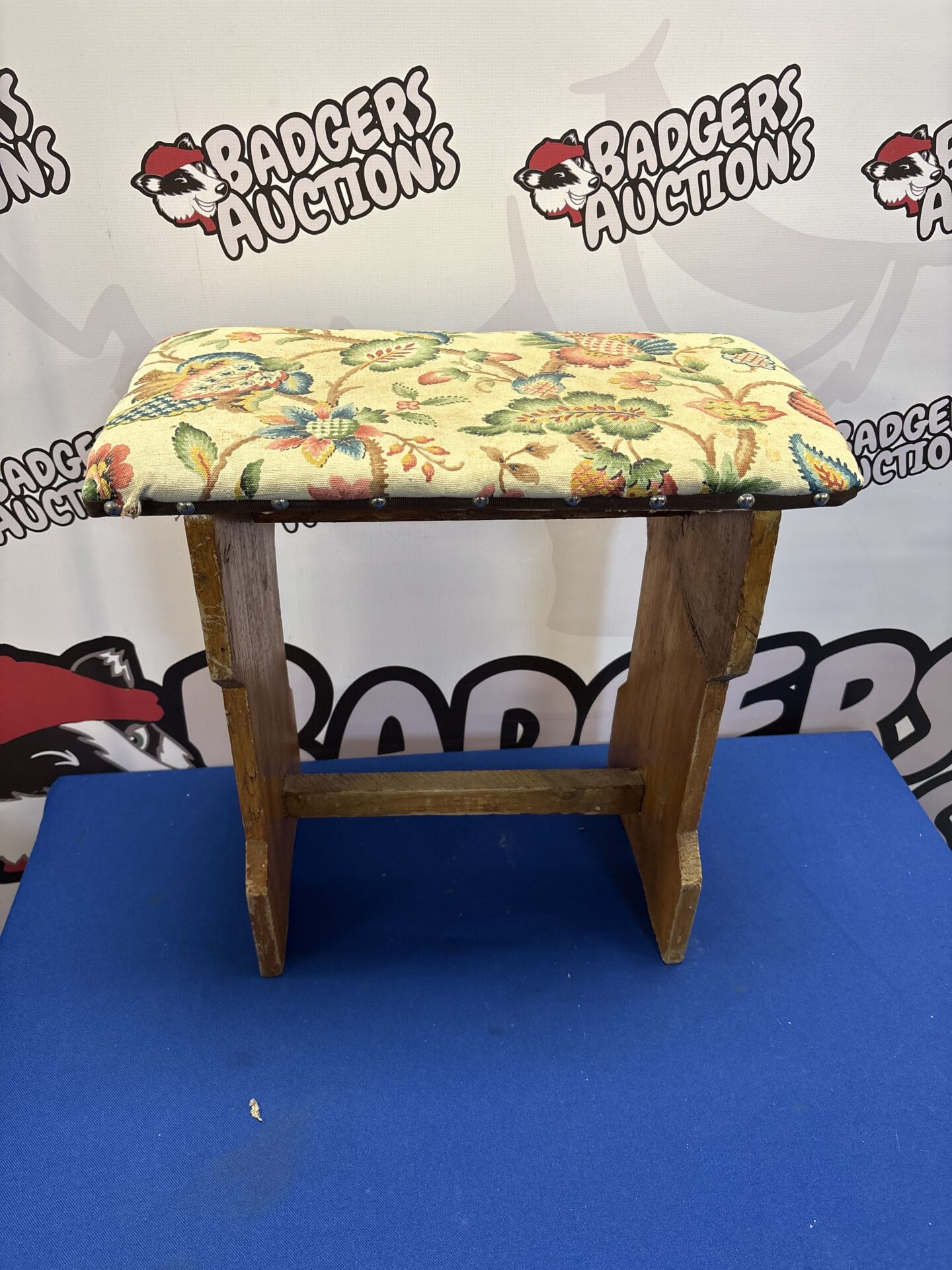This is a vintage piano stool, constructed with a solid pine frame and featuring a beautifully upholstered seat. The seat is adorned with a vibrant floral pattern, adding a touch of elegance and charm. This stool is designed to complement a piano or serve as a decorative accent in a music room or living space.