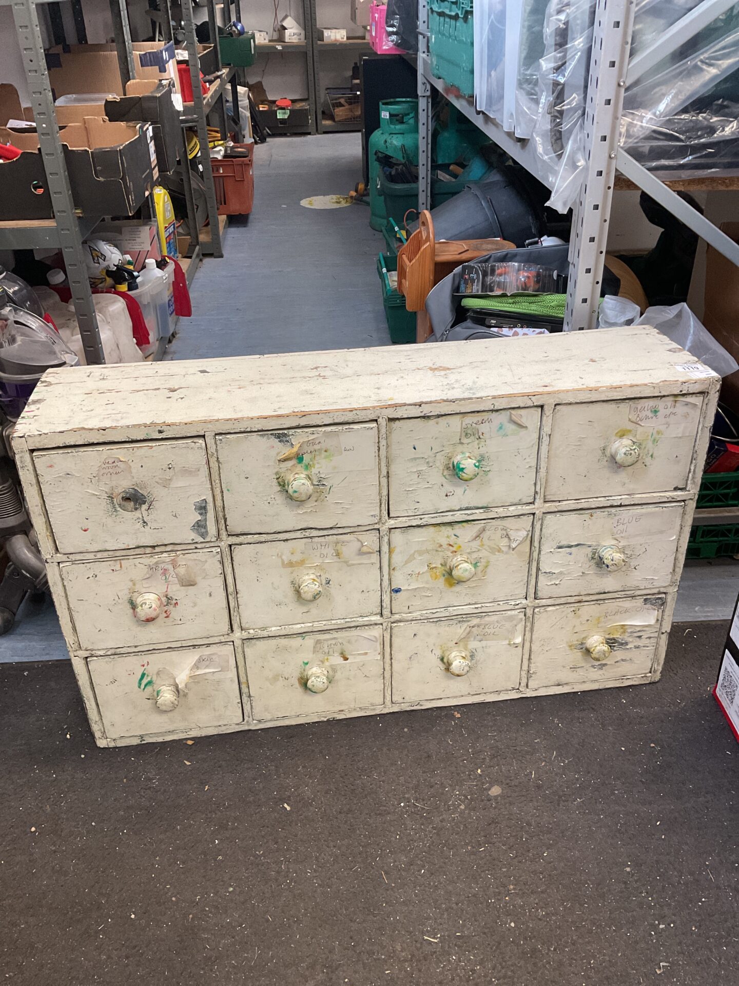 The cabinet shows signs of age and wear, consistent with its vintage nature. There are visible imperfections and patina, adding to its character. This piece would appeal to collectors of antique storage solutions, farmhouse decor enthusiasts, or those seeking a unique organizational item for their home or workspace.