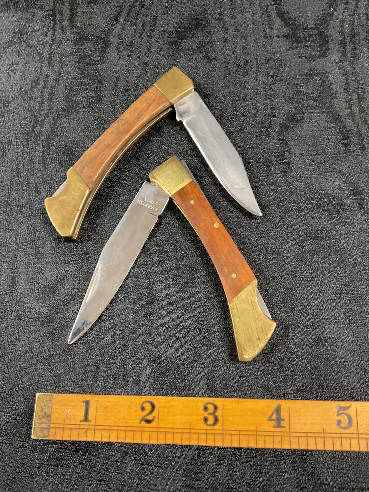 This lot comprises two vintage folding pocket knives, each featuring two blades with ornate bolsters and handles crafted from a warm-toned wood. These knives exhibit classic designs typical of gentleman’s carry knives from the mid-20th century, likely intended for everyday utility and personal use. The blades appear to be carbon steel, and the handles show a lovely patina consistent with age and handling.